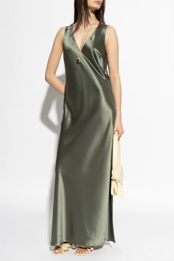 Das Modell ist aus einem dezent glänzenden Stoff gefertigt, der das Licht fein reflektiert und so den typischen „Liquid Look“ edler Satin- oder Seidengewebe erzeugt. Die glatte, grüne Oberfläche des Kleides ist frei von dekorativen Nähten oder weiteren Verzierungen; einziges Schmuckelement ist ein dezentes Detail an der Seite der Brust, das auf subtile Weise den außergewöhnlichen Charakter der Kreation unterstreicht.