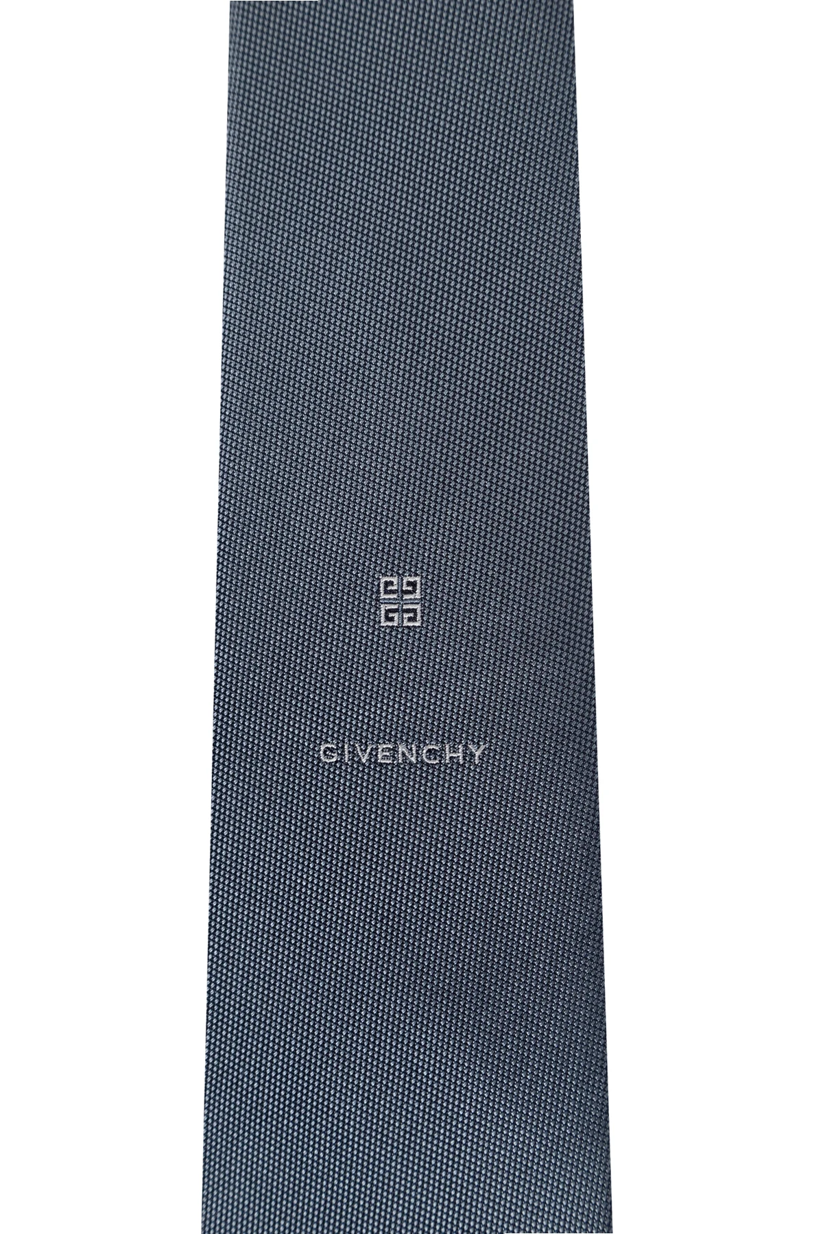 Die Krawatte fasziniert mit einem subtilen Muster im feinen Hahnentritt, das den dominierenden dunkelblauen Farbton dezent auflockert. Die grau-blaue Farbgebung verleiht ihr eine außergewöhnliche Eleganz. Das deutlich sichtbare Givenchy-Logo und der Schriftzug auf der Krawatte betonen ihren Prestige und Markencharakter.