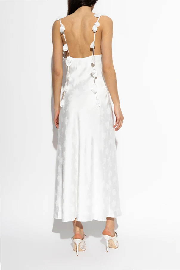 Der charakteristische Wasserfallausschnitt legt sich sanft an die Schulterlinie und unterstreicht die Anmut, während sehr feine, schnurartige Träger in spektakuläre, dreidimensionale Applikationen am Rücken übergehen. Der tief ausgeschnittene Rücken betont Nacken und Schultern und verleiht der Kreation einen besonders exklusiven Charakter.