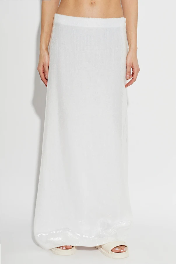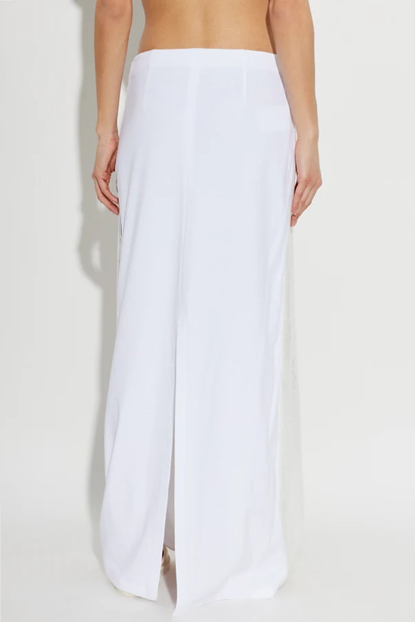 Der Rock mit Schlitz von Moschino ist eine raffinierte Wahl für Liebhaberinnen minimalistischer Eleganz. Das Modell mit langer, gerader Form, leicht nach unten verjüngt, reicht bis zu den Knöcheln und betont subtil die Silhouette. Die weiße Farbe unterstreicht den zeitlosen, luxuriösen Charakter, während die dezent glänzende Stoffstruktur eine Aura von Raffinesse verleiht.