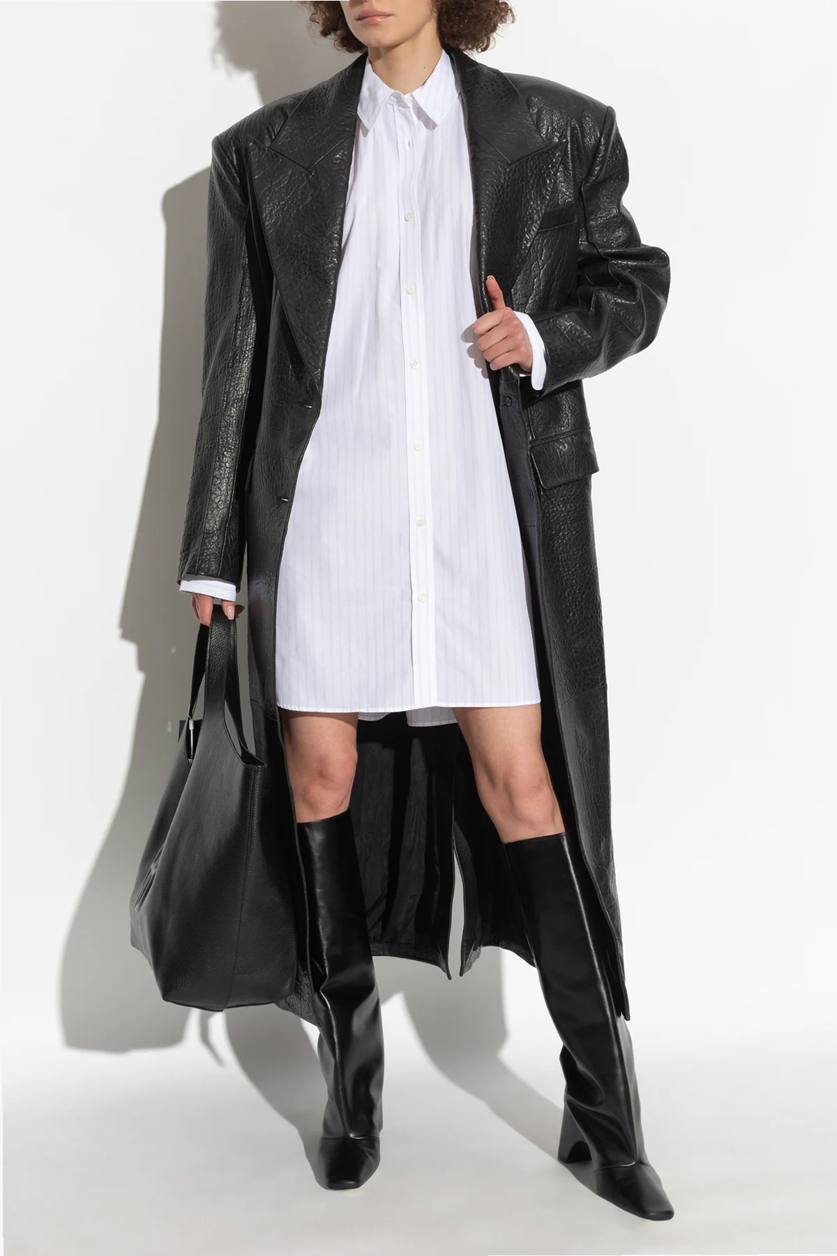 Dieses stilvolle Kleid zeichnet sich durch einen einfachen Schnitt aus, der bis knapp über das Knie reicht. Der klassische Kragen und die Knopfleiste entlang der gesamten Vorderseite betonen seinen eleganten Charakter, während die Manschetten mit doppelten Knöpfen einen modernen Touch verleihen. Die Rückseite des Kleides ist etwas länger als die Vorderseite, was einen asymmetrischen Effekt erzeugt und der Silhouette eine außergewöhnliche Note verleiht.