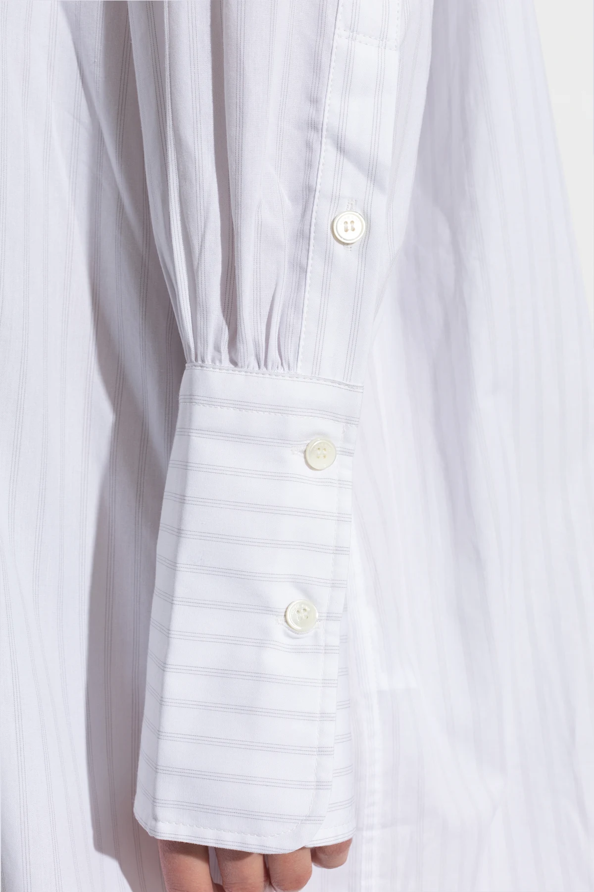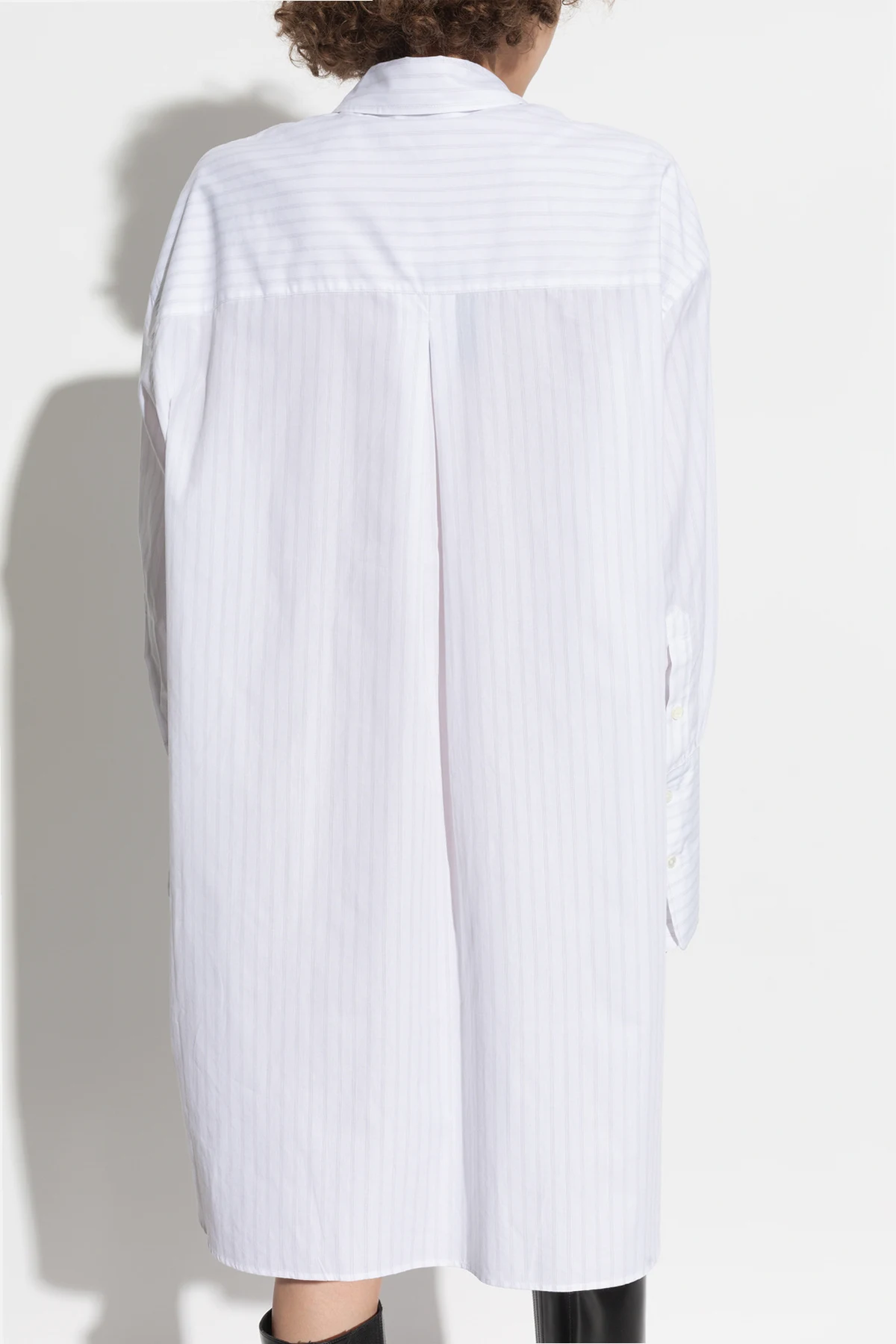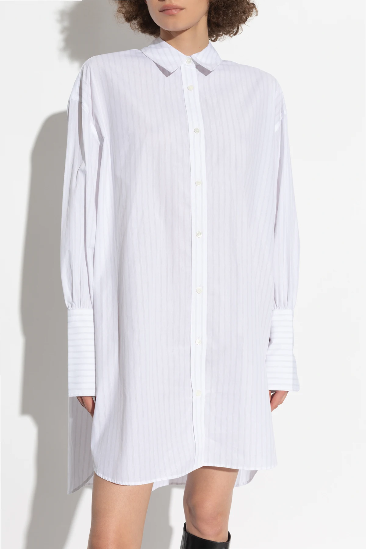 Wir präsentieren Ihnen das außergewöhnliche Hemdblusenkleid aus der exklusiven Kollektion von Anine Bing. Dieses elegante und dennoch lässige Kleid ist aus hochwertiger Baumwolle gefertigt, wodurch es extrem luftig und leicht ist. Die dominierende Farbe ist Weiß, ergänzt durch zarte graue Streifen, die ihm einen subtilen Charme verleihen.