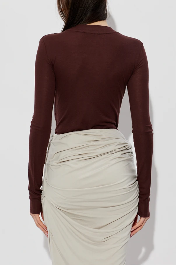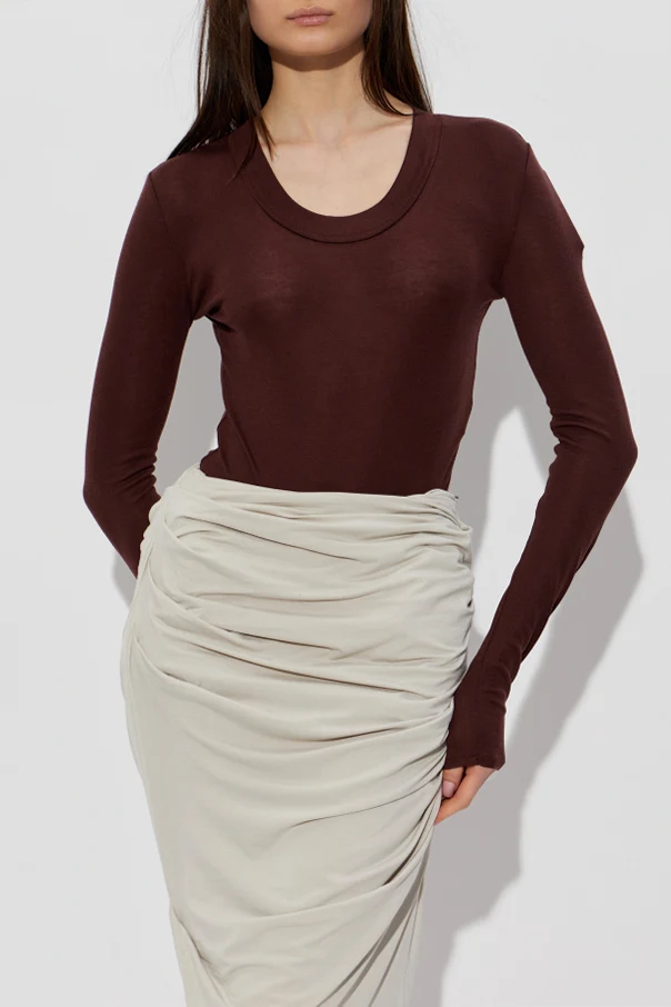 Langarm-Body von ENTIRE STUDIOS ist ein raffiniertes Angebot für alle, die modernen Minimalismus und dezenten Luxus schätzen. Der klassische, figurbetonte Schnitt mit langen, geraden Ärmeln sowie die glatte, einfarbige Oberfläche ohne überflüssige Verzierungen schaffen eine Atmosphäre reiner Harmonie und Eleganz.
