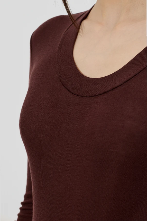 Der hochwertige, dünne Stoff – eine edle Mischung aus Tencel, Wolle und Elasthan – garantiert außergewöhnliche Weichheit und ein angenehm leichtes Tragegefühl. Die Silhouette wird wie eine zweite Haut umschmeichelt. Der runde Ausschnitt mit breiter Blende akzentuiert den Hals dezent und bildet das einzige, geschmackvolle Detail bei diesem Design.