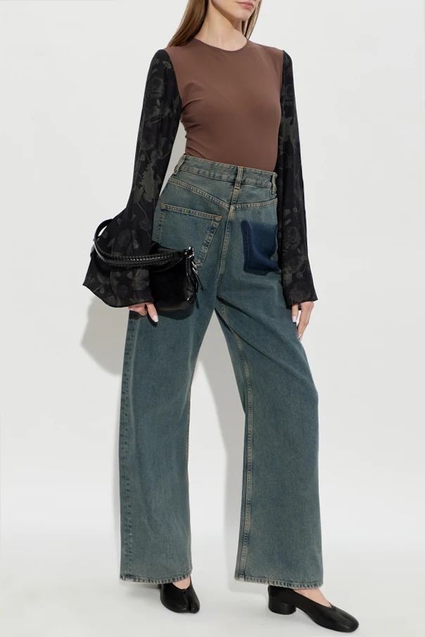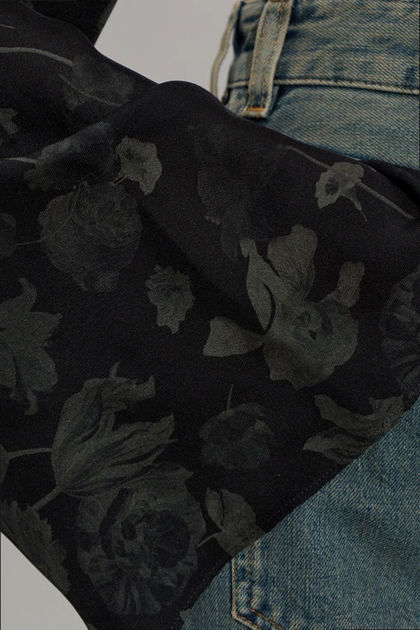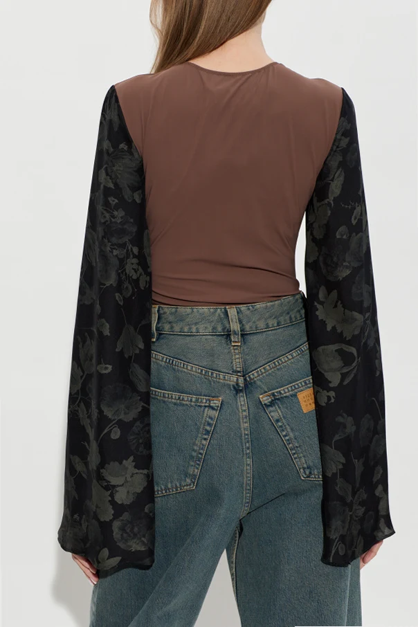 Das außergewöhnliche Gesamtbild wird durch lange, weit ausgestellte Ärmel aus leichter, halbtransparenter Stoffqualität geprägt, die mit einem matten, botanischen Muster auf schwarzem Hintergrund verziert sind. Der abgerundete Ausschnitt betont die minimalistische Form, während das Fehlen sichtbarer Reißverschlüsse oder Logos den Geist raffinierter Schlichtheit widerspiegelt, der die Kreationen von Maison Margiela auszeichnet.