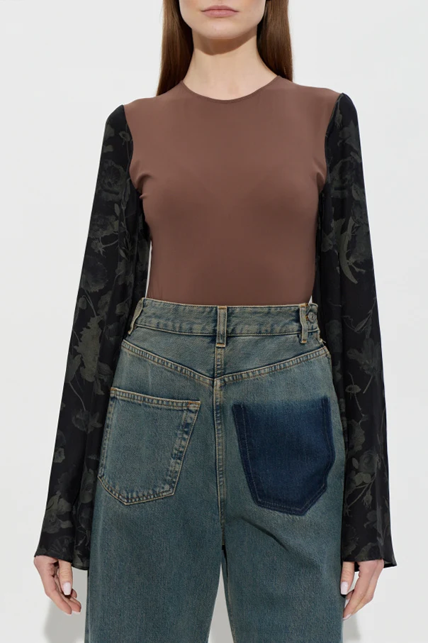 Raffinierte Kombination aus braunem, glattem Korpus und kunstvollen, floralen Ärmeln