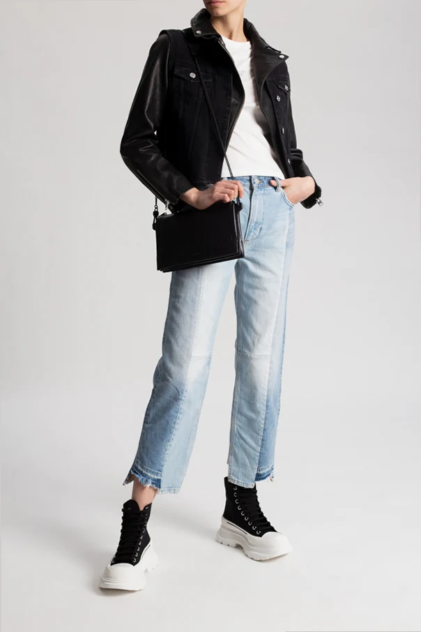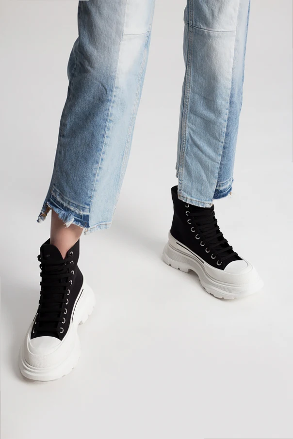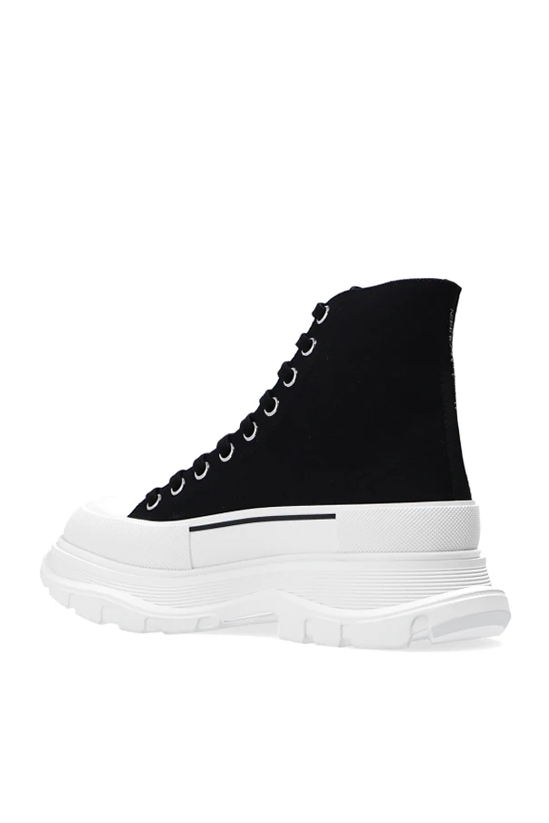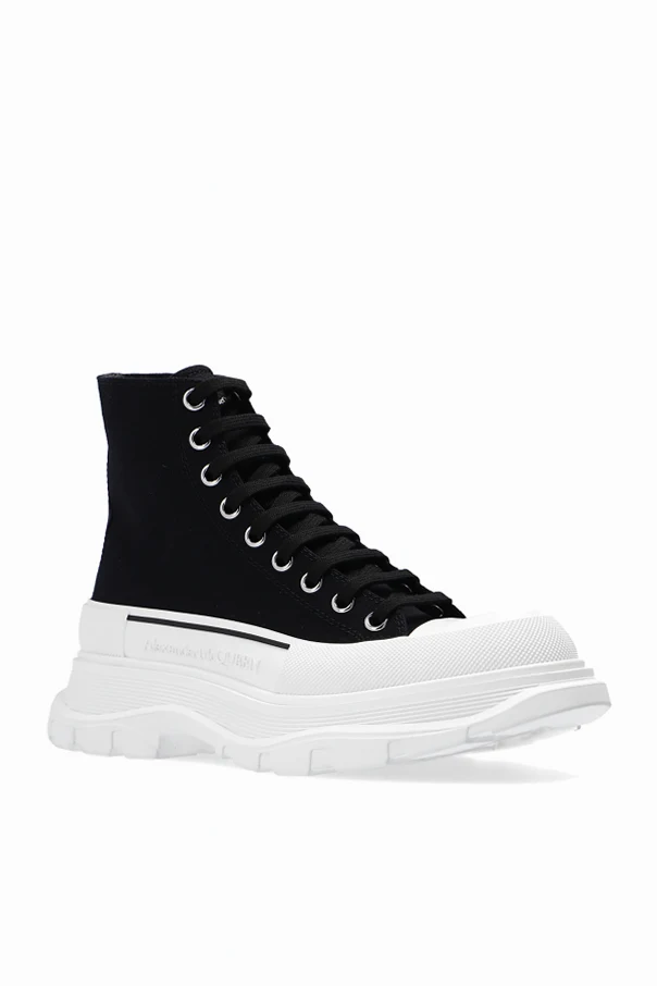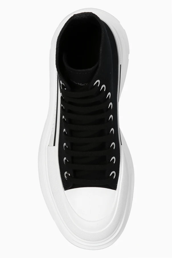 Black high-top platform sneakers from Alexander McQueen. Set on a white rubber sole, this lace-up pair features a silver-tone logo printed on the tongue and a grosgrain pull tab at the back.