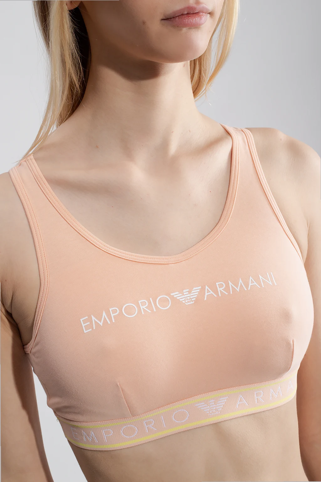 Light orange bra from Emporio Armani. Made of cotton, this style features a round neck and an elasticated waistband accentuated with a white and yellow logo.