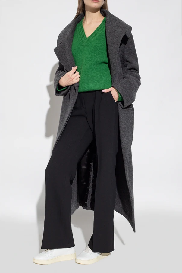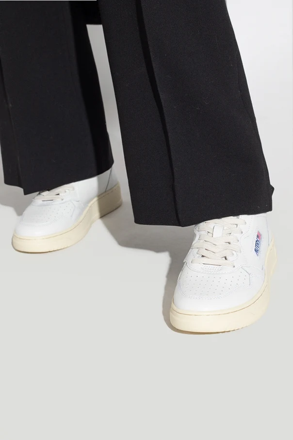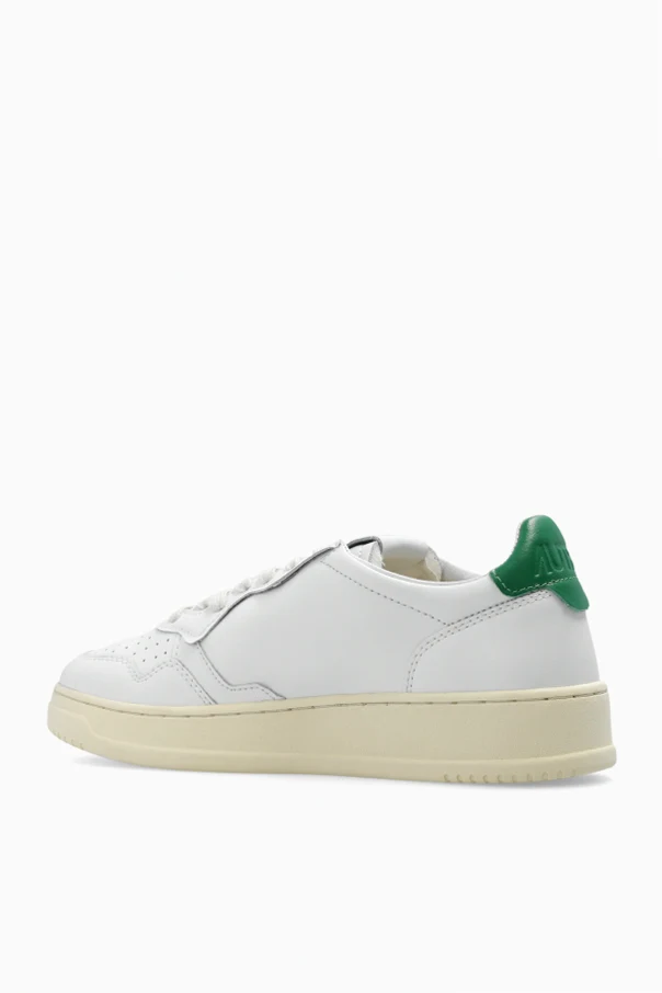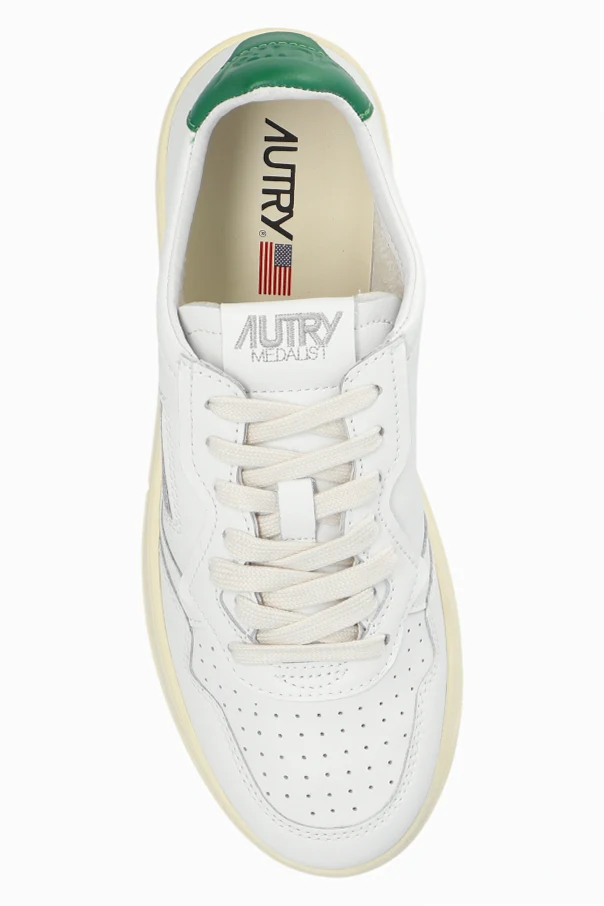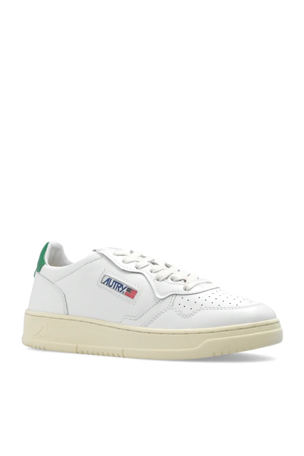 White ‘Medalist’ sneakers from Autry. Made of leather, this lace-up model sits on a cream rubber sole and showcases a raw-trimmed tongue, logo detailing, perforations on the front and a green heel counter.