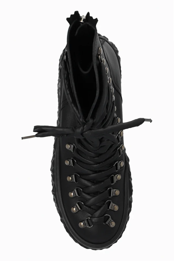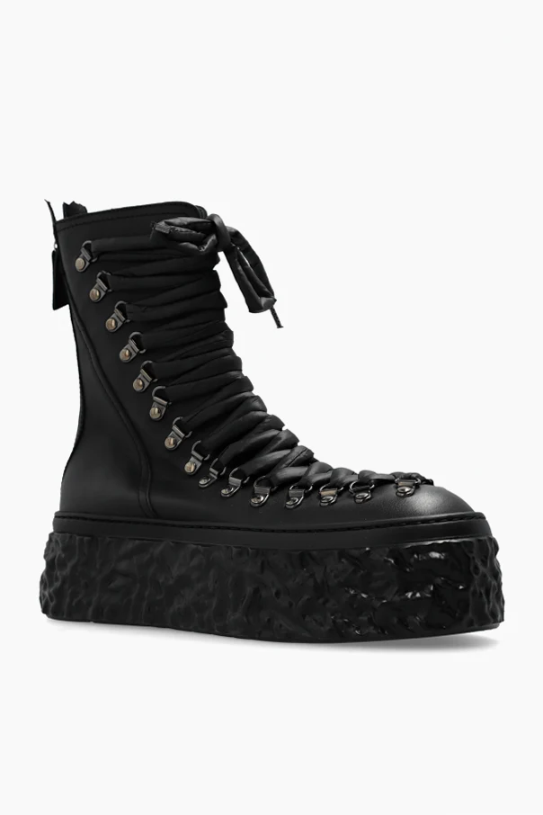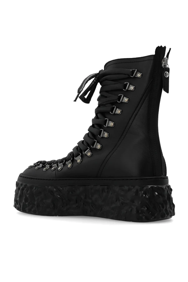 Gefertigt aus hochwertigem schwarzen Leder, präsentieren sich diese Stiefel atemberaubend und strahlen Eleganz aus. Der hohe Schnitt, der über den Knöchel reicht, in Kombination mit der massiven, unregelmäßigen Struktur der Sohle, verleiht ihnen einen unverwechselbaren Look. Die durchgehende Schnürung mit Metallösen sowie das zusätzliche Bindeband oben, inspiriert vom Militärstil, betonen ihren mutigen Stil.