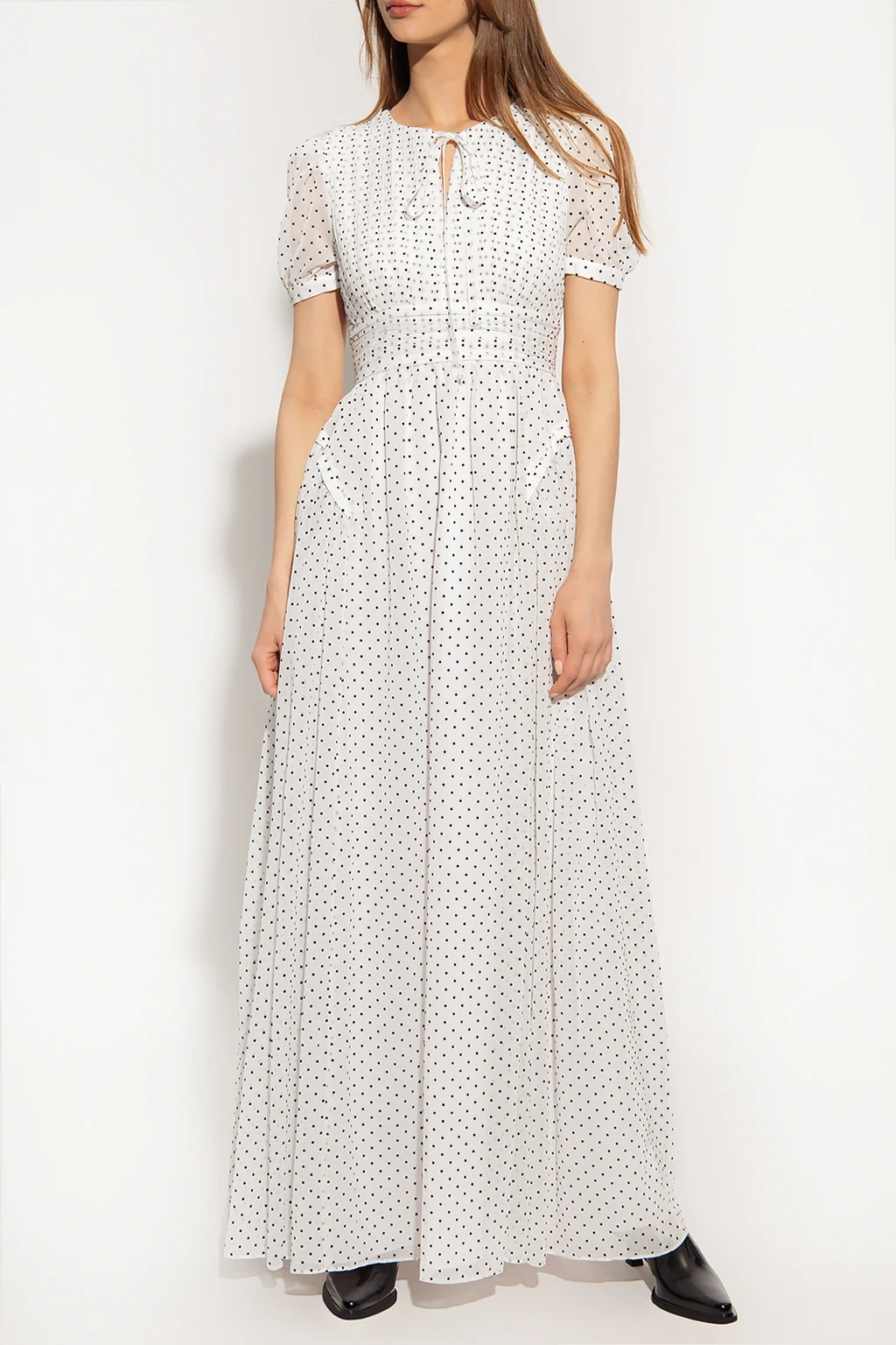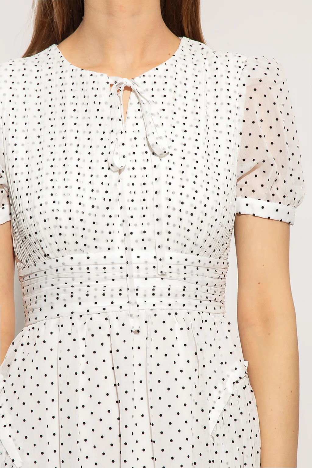 White flared dress from Self Portrait. Fastened with a back zip, hook and button, this short sleeve design is enriched by a black polka dot print, draped details and a round neck with a slit and ties.