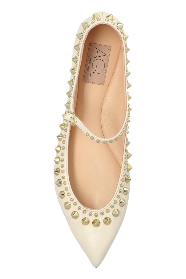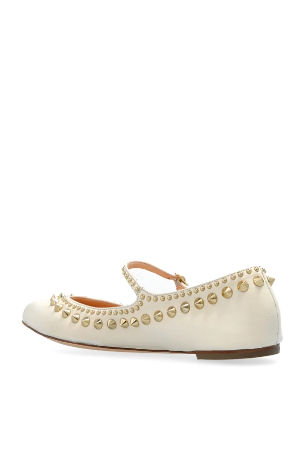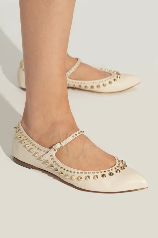 Aus hochwertigstem Leder gefertigt, strahlen die Ballet Flats in einem cremigen Ton einen subtilen Glanz aus. Ihre abgerundete Spitze und der Halt gebende Riemen bieten nicht nur einen unverwechselbaren Stil, sondern auch Komfort beim Tragen. Zusätzliche Verzierungen sind goldene Metallnieten, die einen raffinierten Charakter verleihen.