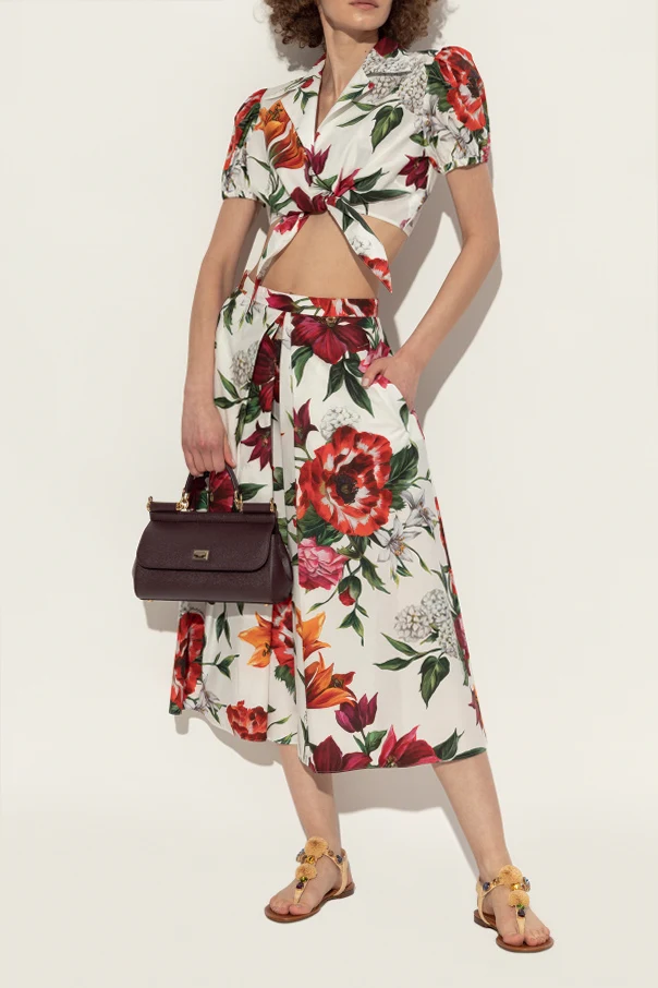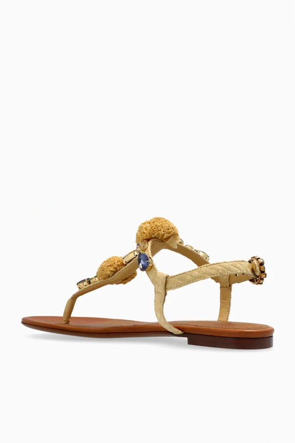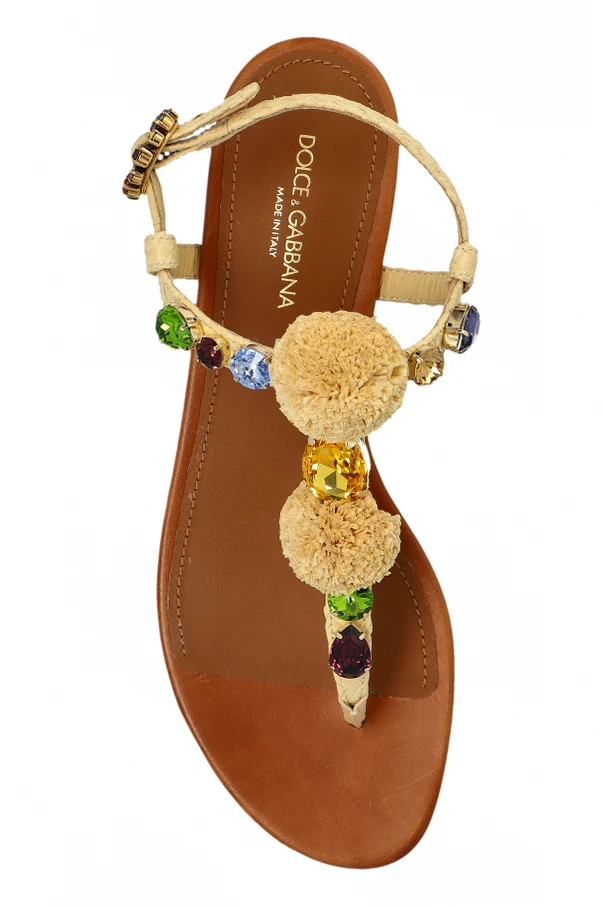 Die Riemen der Sandalen bestehen aus einem Material mit einer feinen, matten Textur, inspiriert von natürlichem Bast, während das Innere mit zartem, glattem Leder ausgekleidet ist, das für höchsten Tragekomfort sorgt. Krönender Abschluss ist eine kunstvolle Komposition von Applikationen an der Schnalle – ein wiedererkennbares Merkmal der unverwechselbaren Ästhetik von Dolce & Gabbana.