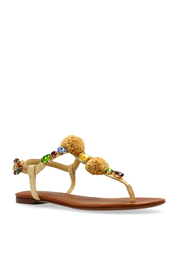 Sandalen mit glänzenden Applikationen von einer Marke, die seit Jahrzehnten den italienischen Chic definiert, vereinen auf harmonische Weise Schönheit und Funktionalität. Die klassische T-Bar-Form mit einem zarten Riemchen um den Knöchel legt den Fuß frei und unterstreicht die Leichtigkeit des Schritts. Für zusätzliche Eleganz sorgen beeindruckende beigefarbene Pompons sowie kunstvoll eingefasste, mehrfarbige Steine – in goldenen, grünen, himmelblauen und amethystfarbenen Nuancen – die im Licht erstrahlen.