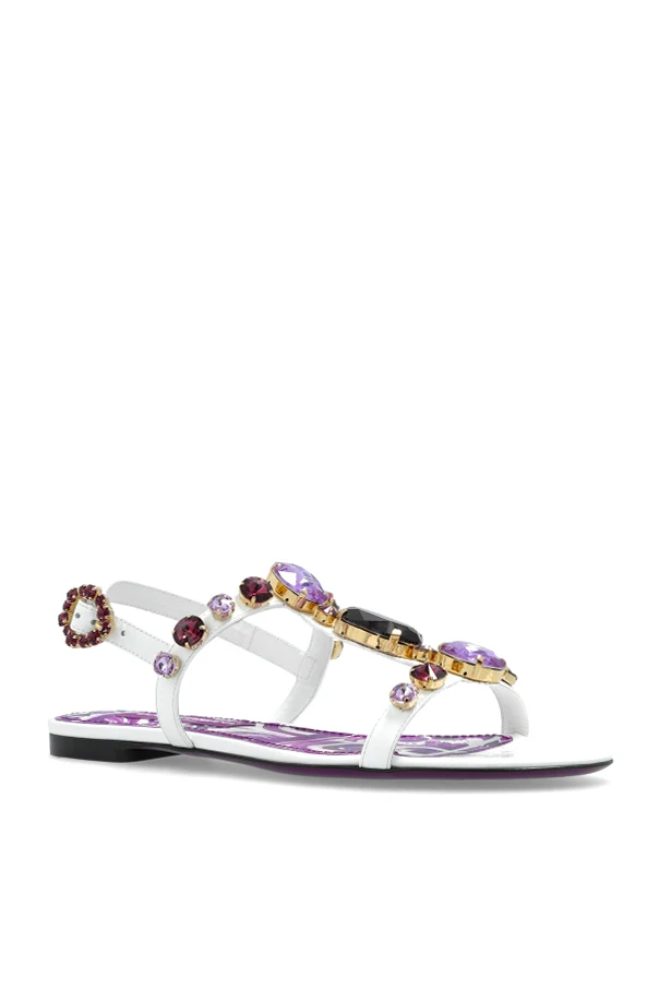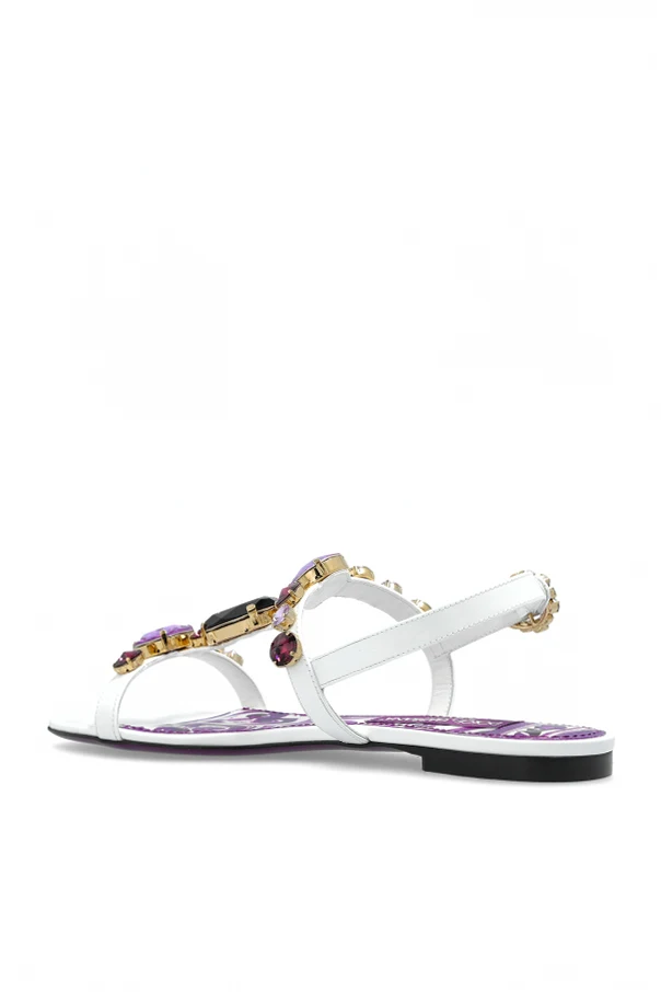 Lederne Sandalen mit glänzenden Kristallen sind das Synonym für raffinierten Luxus, inspiriert von der italienischen Tradition der Marke Dolce & Gabbana. Weiße Riemen aus hochwertigem Naturleder umschmeicheln sanft den Fuß und betonen seine schlanke Form, während die flache Sohle und die leicht abgerundete Silhouette für Komfort bei sommerlichen Outfits sorgen.