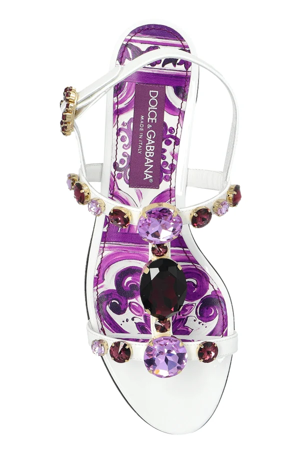 Das faszinierendste Detail sind die auffälligen Kristalle in Violett- und Rosatönen sowie mit einem tiefen, nachtblauen Akzent, sorgfältig in goldene Fassungen eingefasst und mit handwerklicher Präzision auf den Riemen platziert. Ein zusätzlicher Akzent ist der dekorative, violett-weiße Print auf der Innensohle, der das Gesamtbild mit einem bezaubernden Detail abrundet.