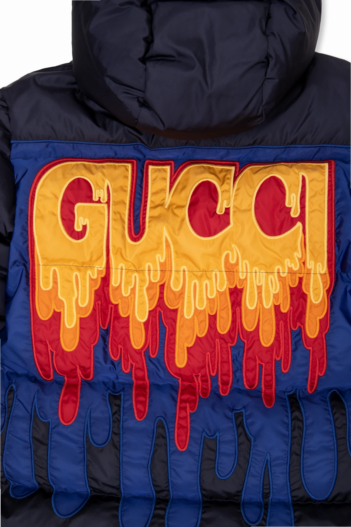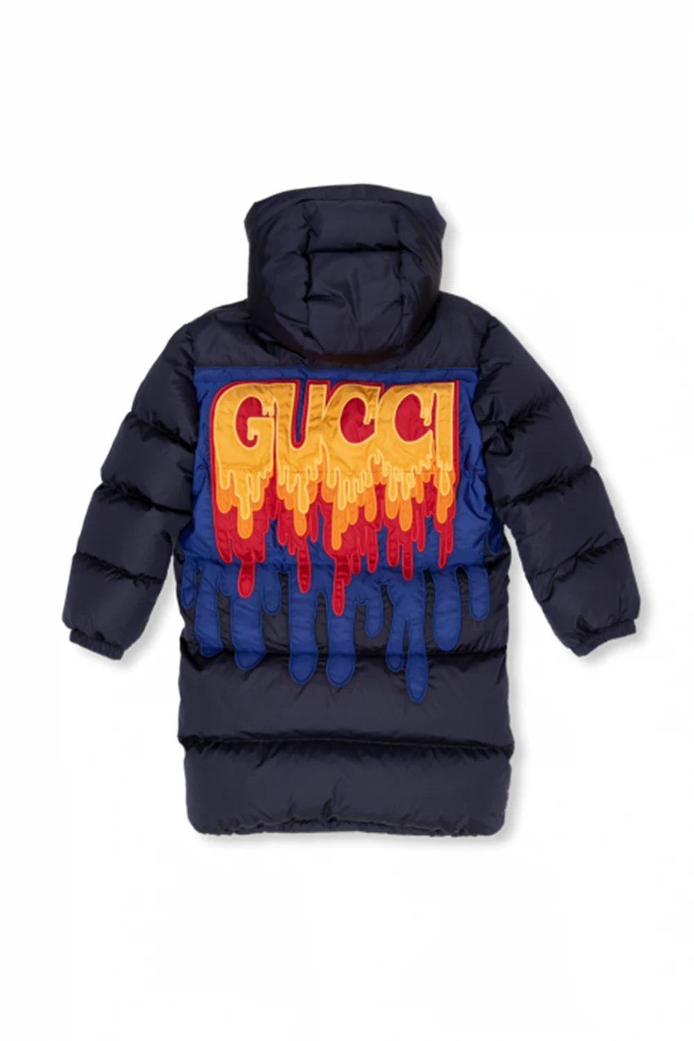 Long, navy jacket from Gucci Kids. Padded with goose down, this design features a two-way zip, yellow logo patch on the front, yellow, orange and red logo patch at the back, two snap-fastened pockets and ribbed trims at the hem and cuffs.