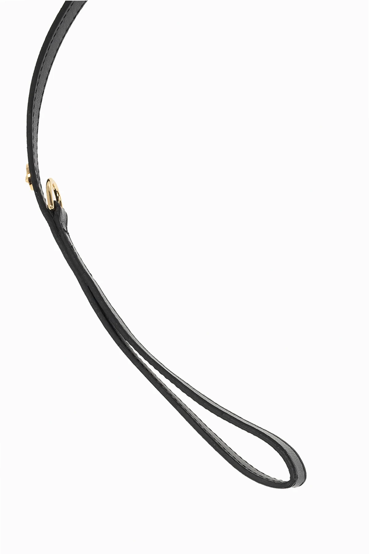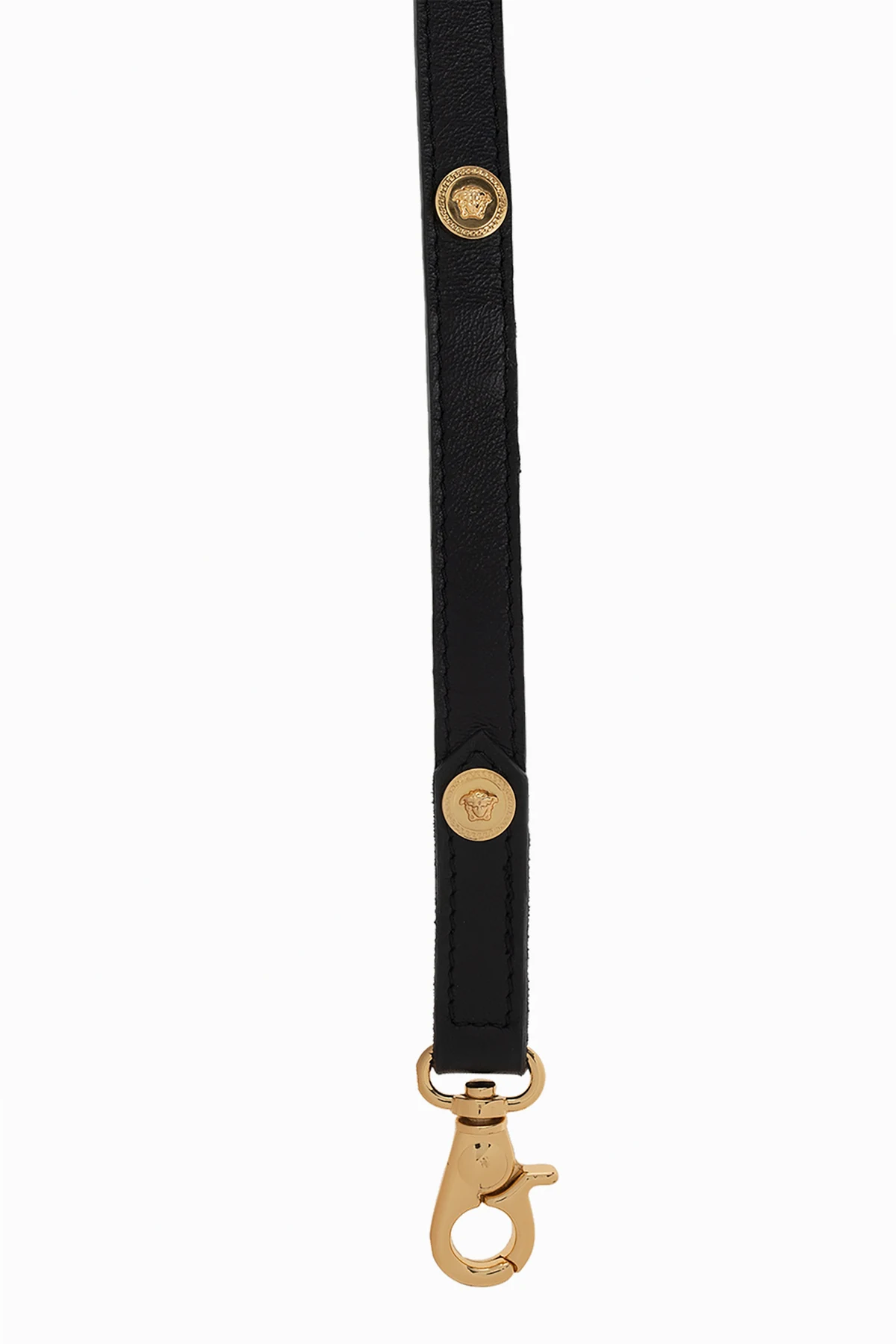 Black dog leash from Versace Home. Made of calf leather, this item features a metal clip and the label’s signature Medusa head details in gold-tone.