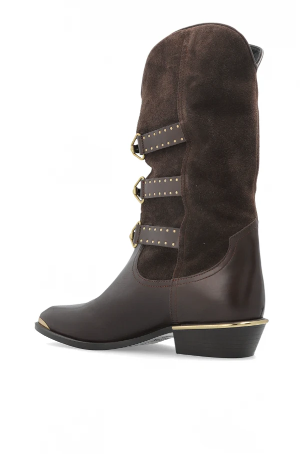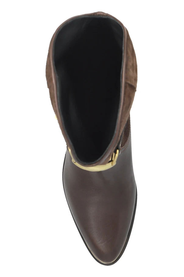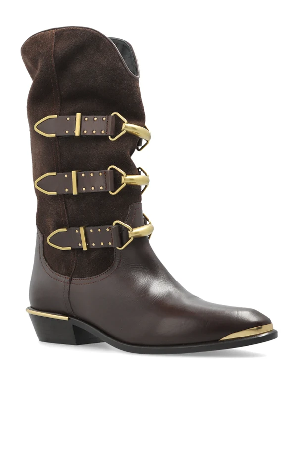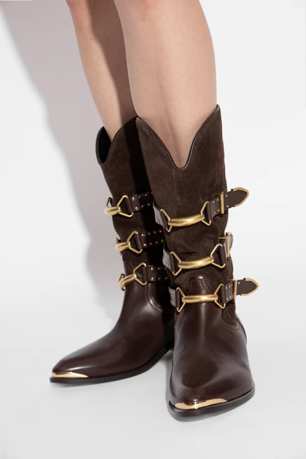 Die Cowboy-Stiefel „Mexia” von Isabel Marant verkörpern die Quintessenz französischer Lässigkeit und sportlicher Eleganz. Ihre klassische, schlanke Silhouette mit verlängerten Spitzen und einem bis unter das Knie reichenden Schaft wurde bis ins kleinste Detail perfektioniert. Der untere Teil des Stiefels, gefertigt aus glattem und glänzendem Echtleder , harmoniert edel mit dem matten Schaft aus samtigem Veloursleder im selben noblen Braunton.