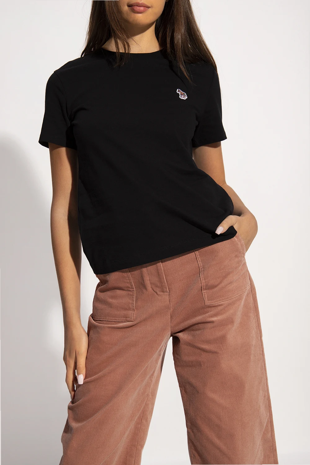 Black T-shirt from PS Paul Smith. Crafted from organic cotton, this short sleeve design features a multicolored logo pattern and ribbed crewneck.