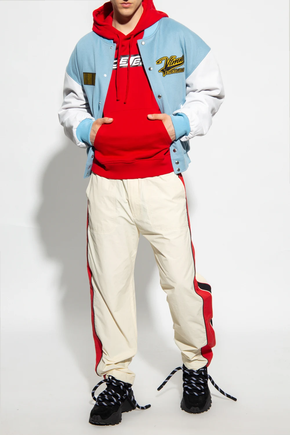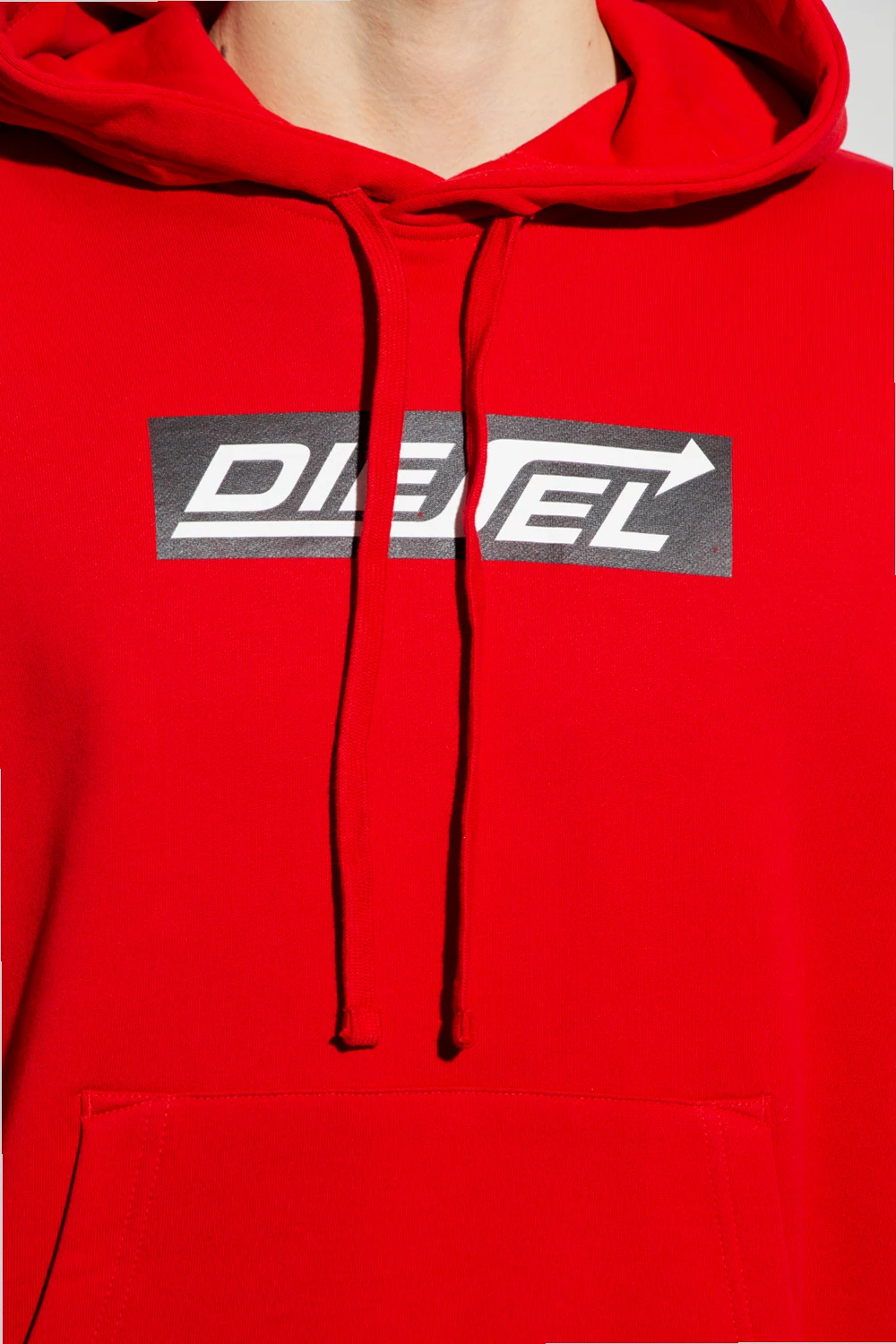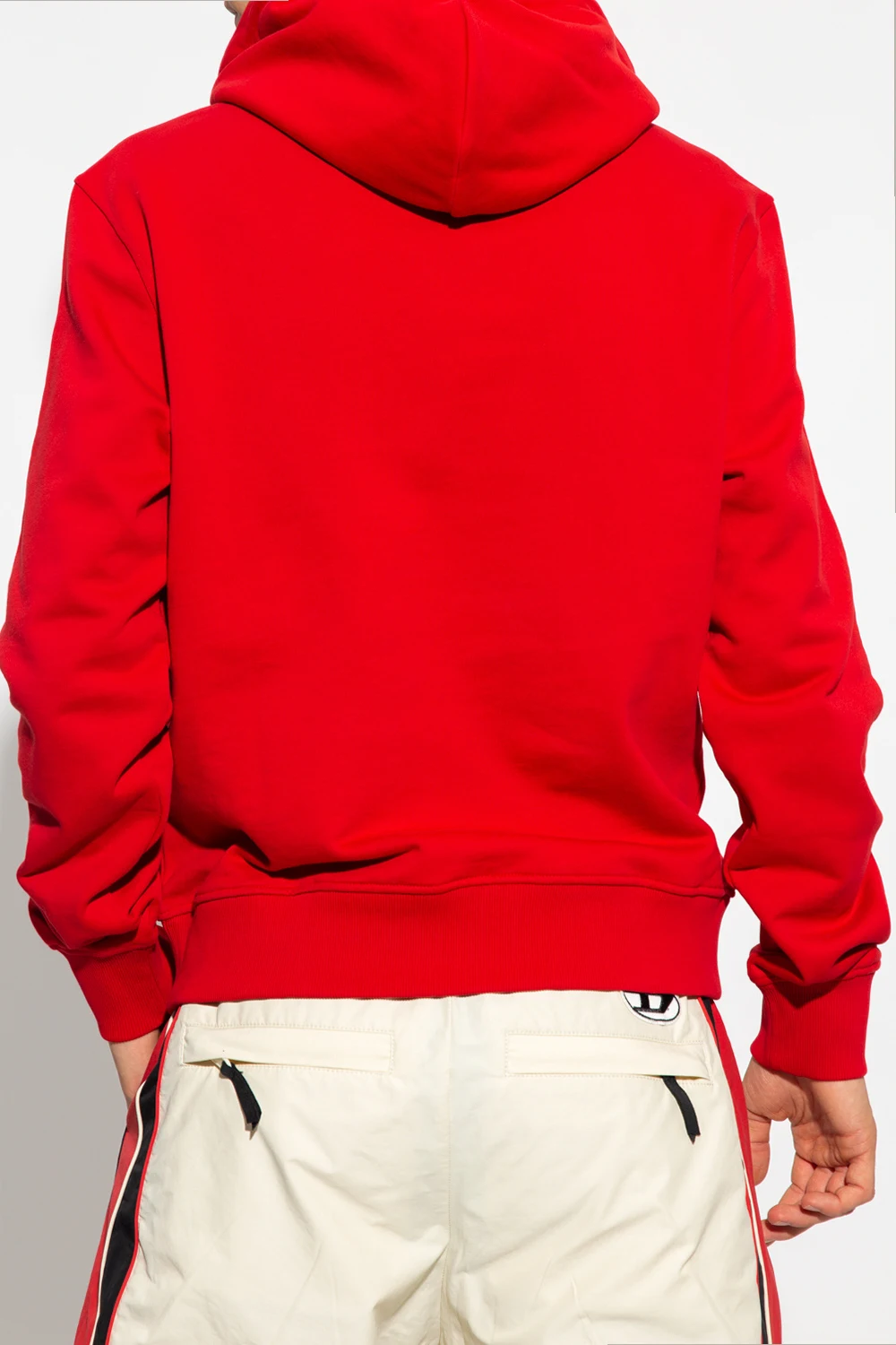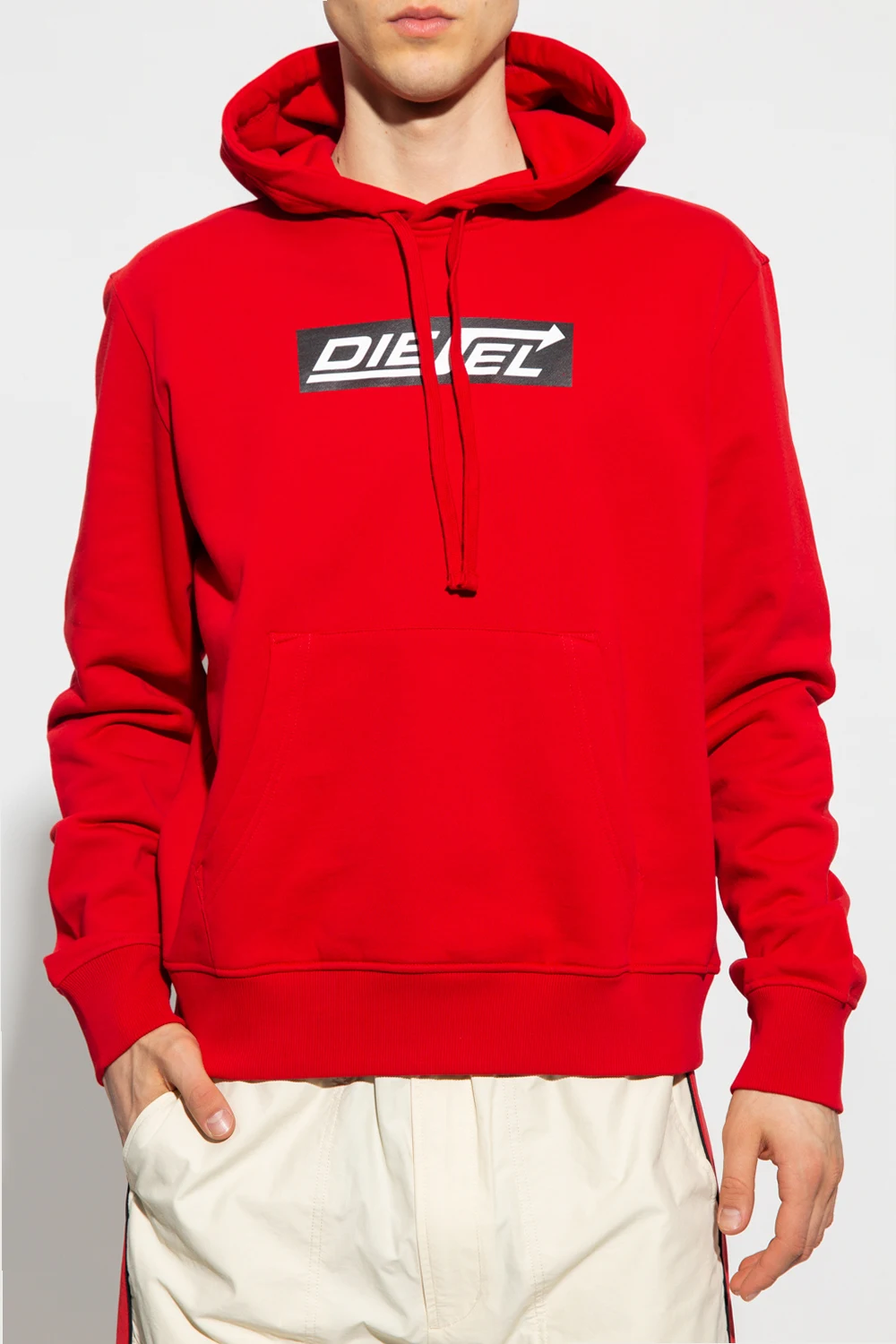 Red 'S-GINN-HOOD-HS1' hoodie from Diesel. Made of cotton, this garment features a drawstring hood, black and white logo print, slip pocket and ribbed trims at the hem and cuffs.