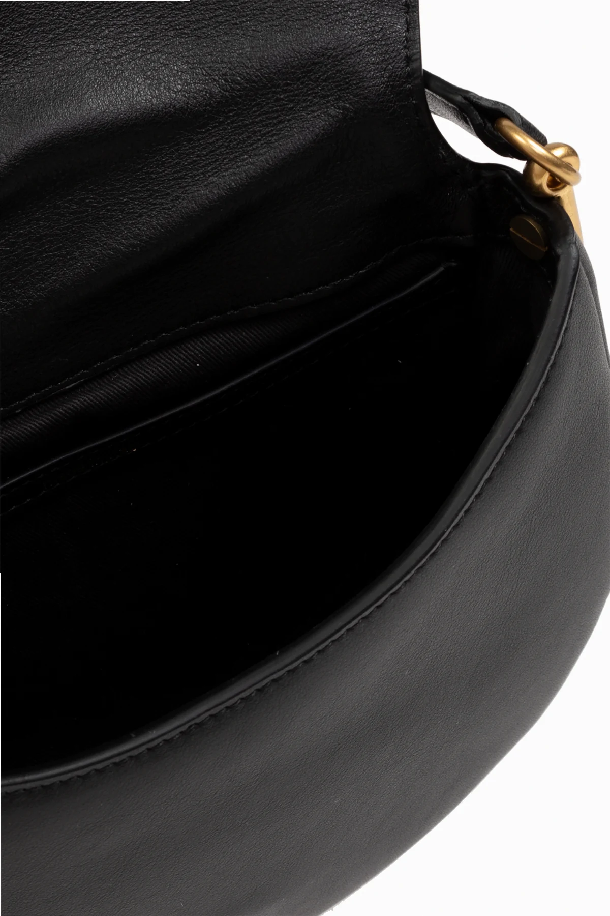 Hergestellt aus hochwertigem Kalbsleder, kombiniert die Tasche „Kate” Haltbarkeit und luxuriöses Aussehen. Die dominierende schwarze Farbe macht sie vielseitig und leicht mit verschiedenen Outfits kombinierbar. Der breite Schulterriemen, ebenfalls aus Leder gefertigt, sorgt für Tragekomfort, und zusätzliche goldene Metallelemente, wie die Schnalle am Riemen, verleihen ihr Eleganz und Klasse.