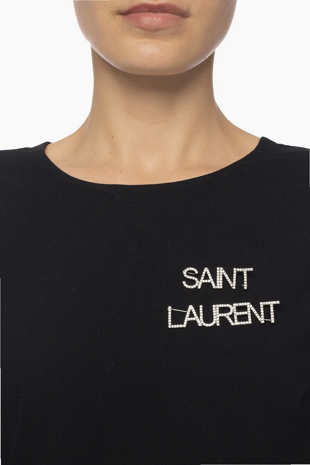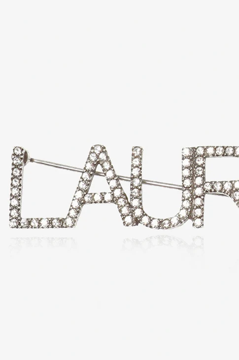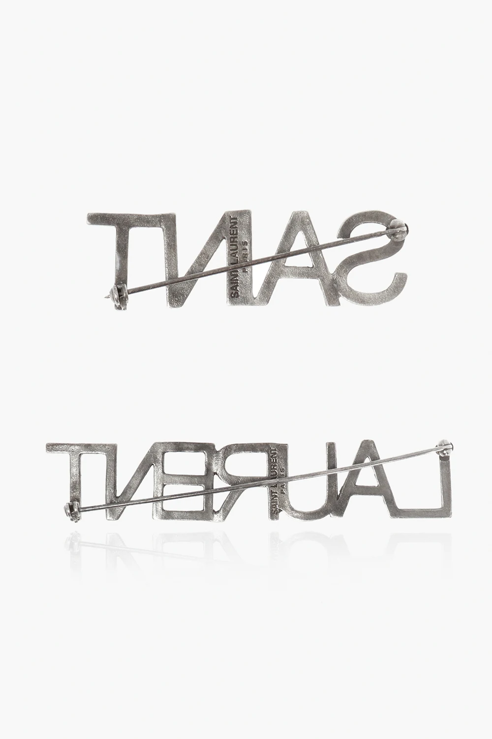 Two silver-tone brooches featuring a logo from Saint Laurent. Encrusted with white decorative elements.