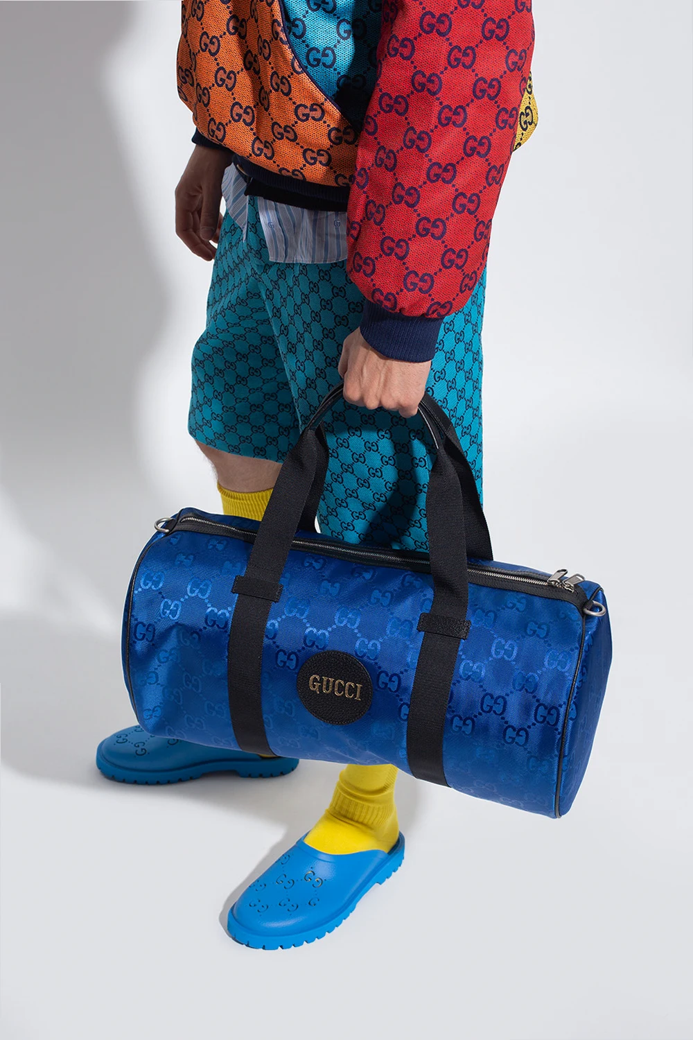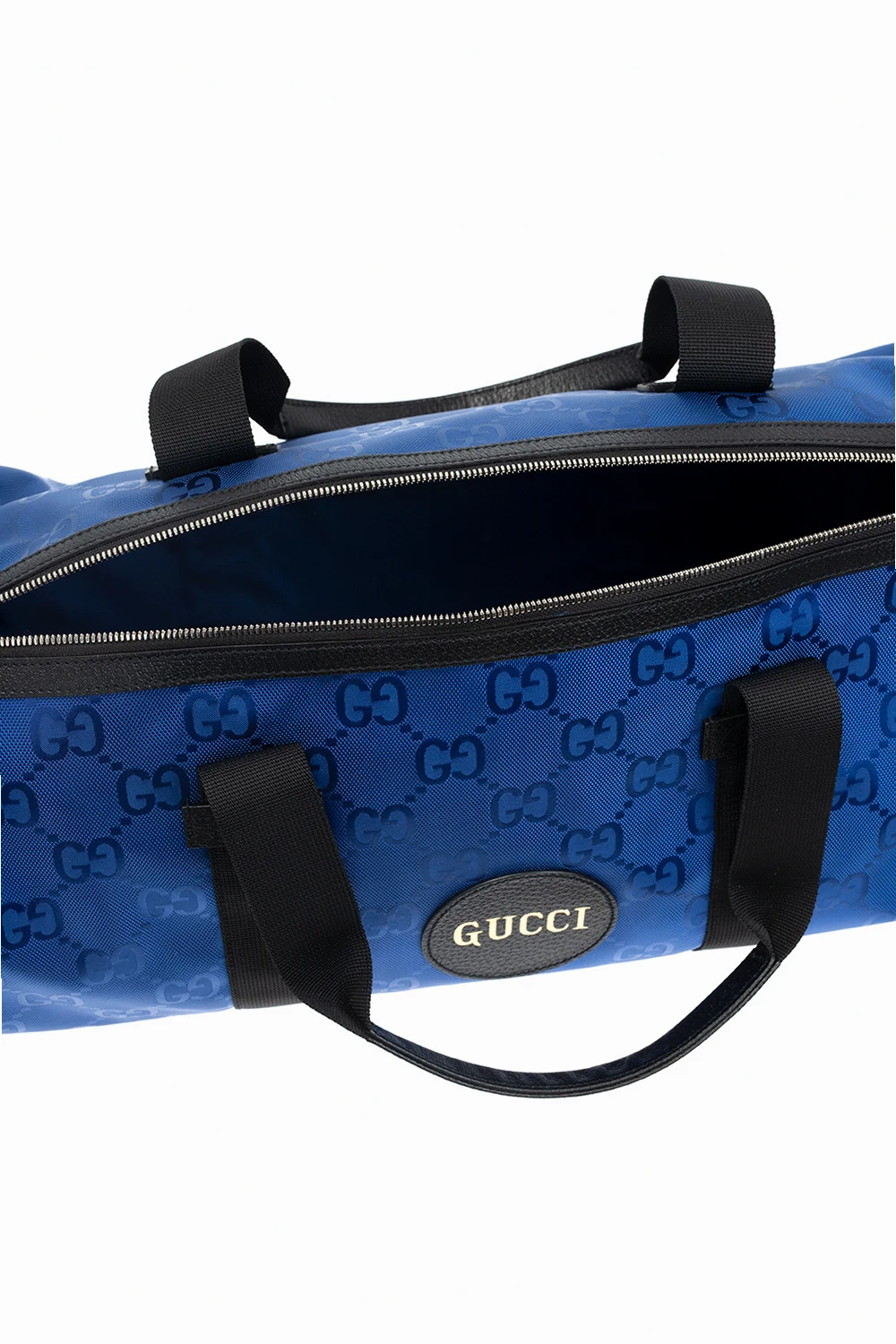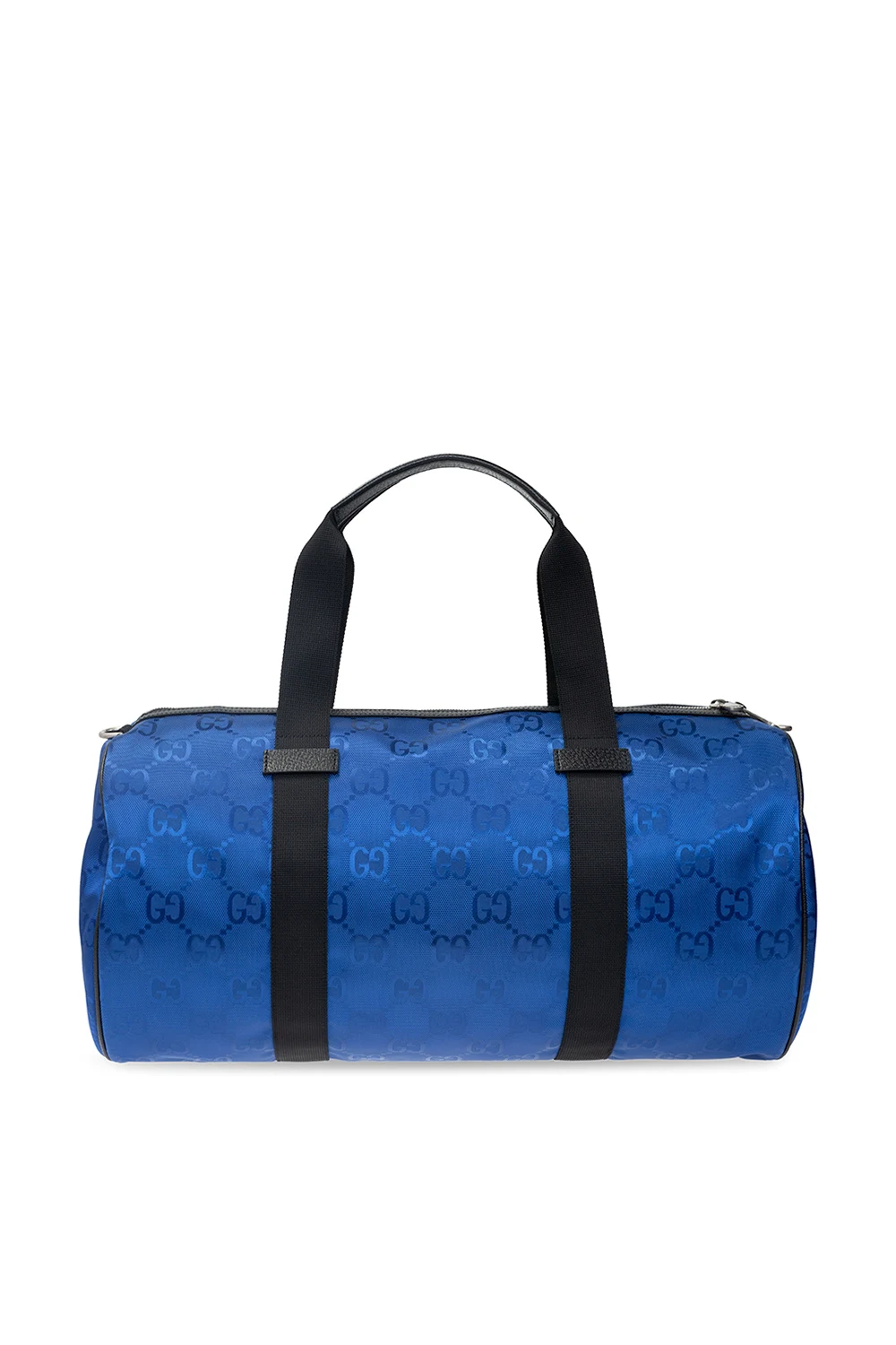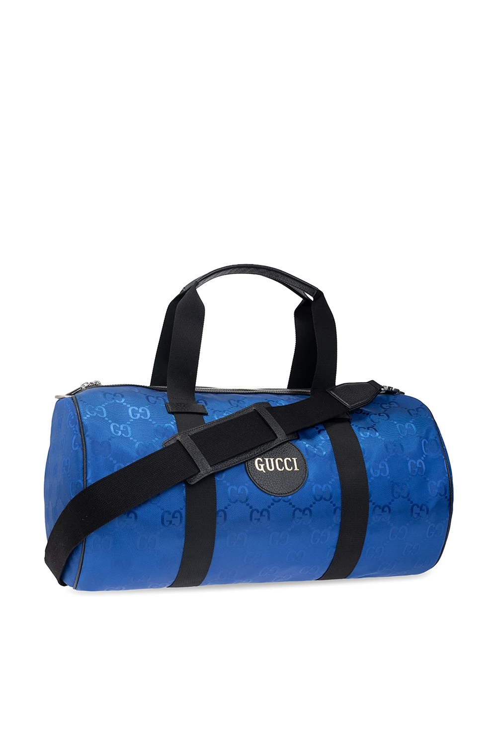 Blue duffel bag from Gucci, the ‘Off The Grid’ collection. Crafted from the innovative ECONYL material, this design fastens via a two-way zip and features an all-over GG pattern in jacquard, leather trims, a patch with an embossed gold-tone logo, two half-round handles, an adjustable and detachable shoulder strap, silver-tone metal hardware and an interior with one compartment and two zipped pockets.