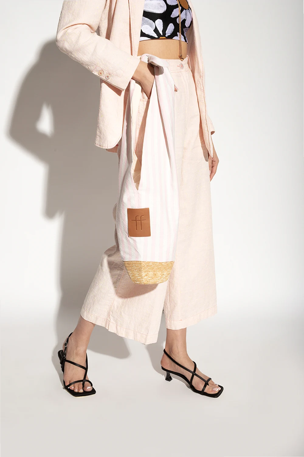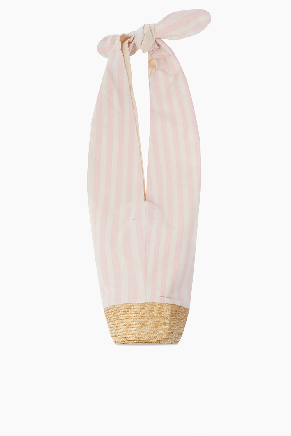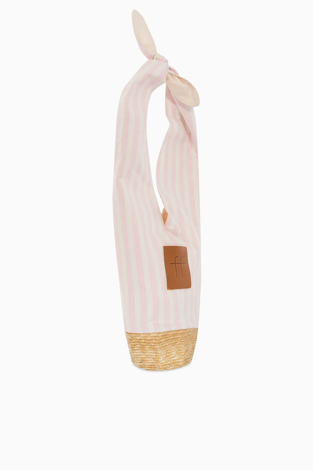 White and light pink bucket bag from Forte Forte. Crafted from cotton canvas, this design showcases a vertical stripe pattern, a brown patch with an embossed logo on the front, a soft top handle, woven raffia detailing at the bottom and one internal compartment.