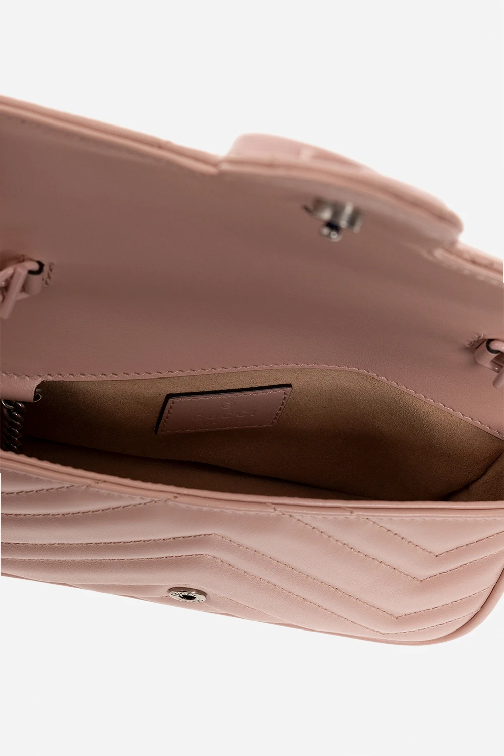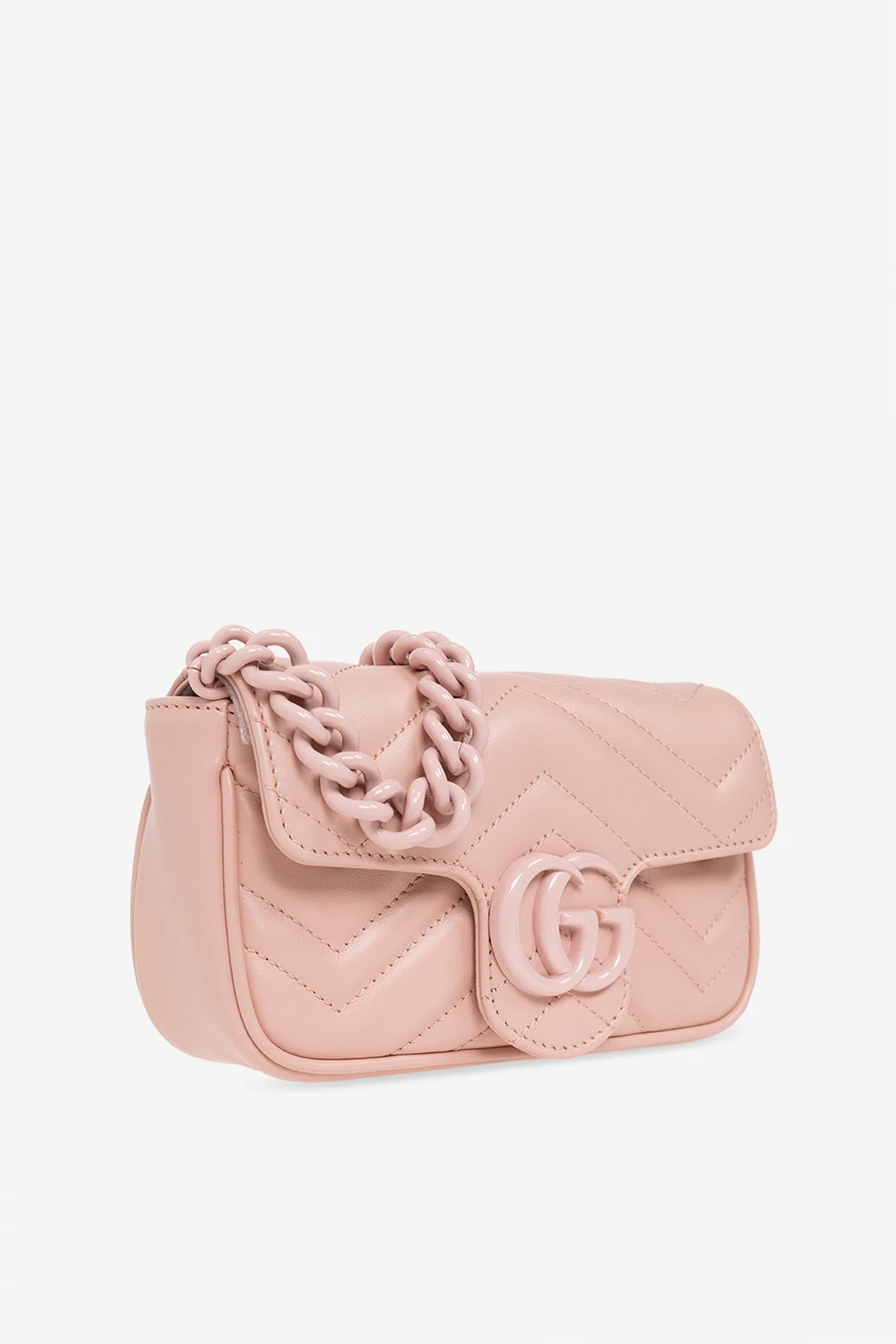 Blush pink ‘GG Marmont 2.0’ belt bag from Gucci. Crafted from quilted leather, this design secures with a snap and features Double G hardware on the front, a detachable and adjustable chain strap, blush pink metal elements and one internal compartment with a removable lobster clasp closure.