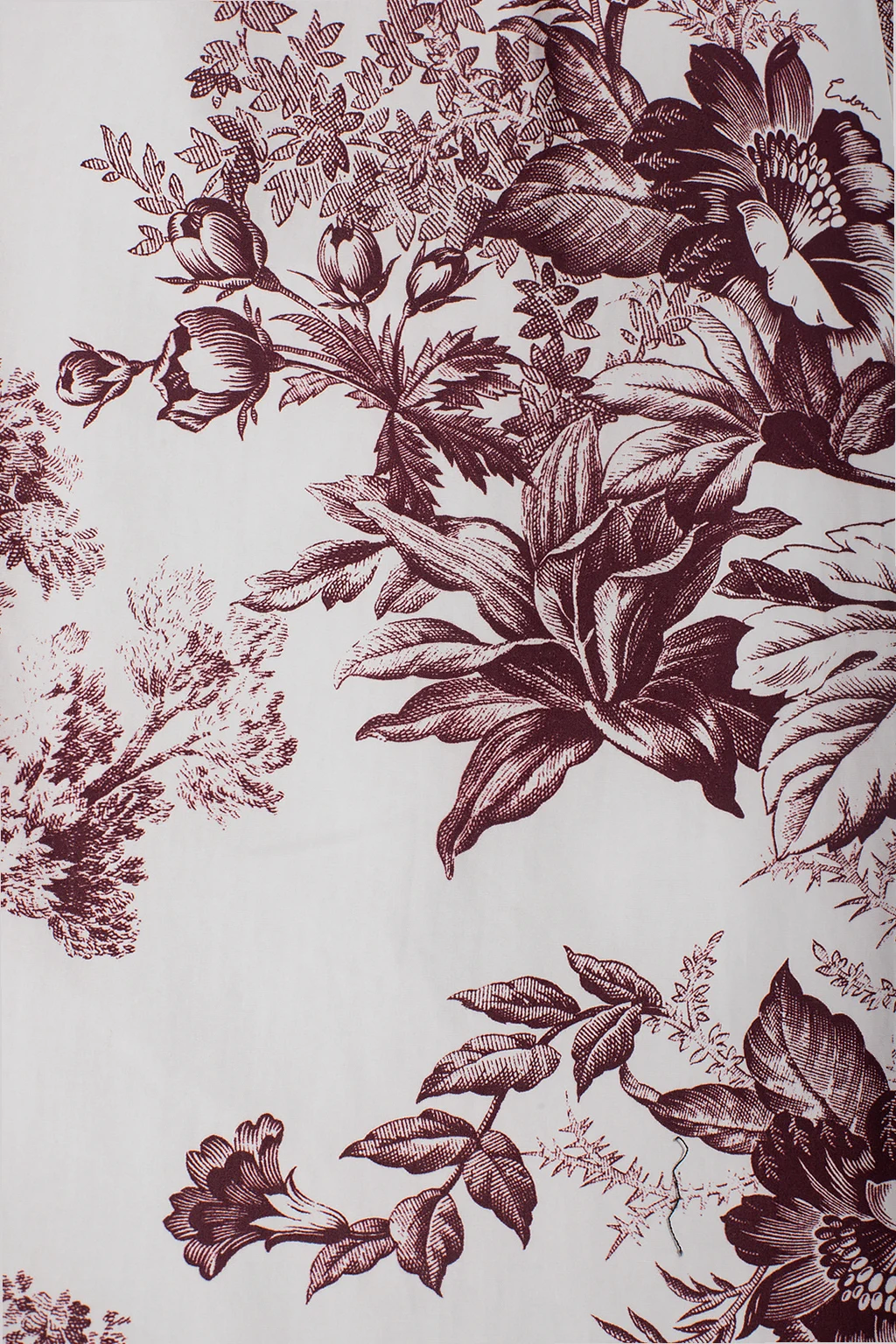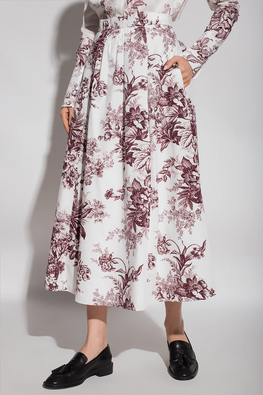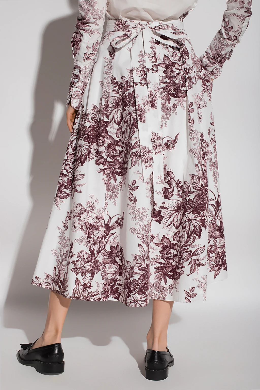 White ‘Bernadette’ skirt from Erdem. Crafted from cotton poplin, this design features a concealed zip and hooks, decorative ties, two slip pockets and all-over maroon Pembridge Etched Floral print inspired by Toile De Jouy.