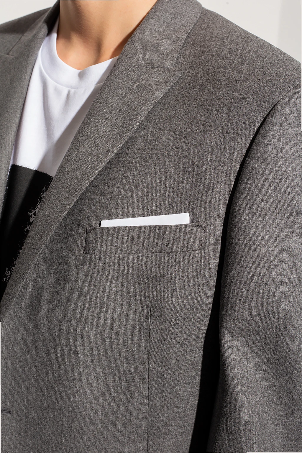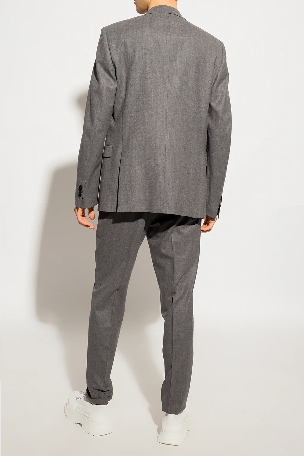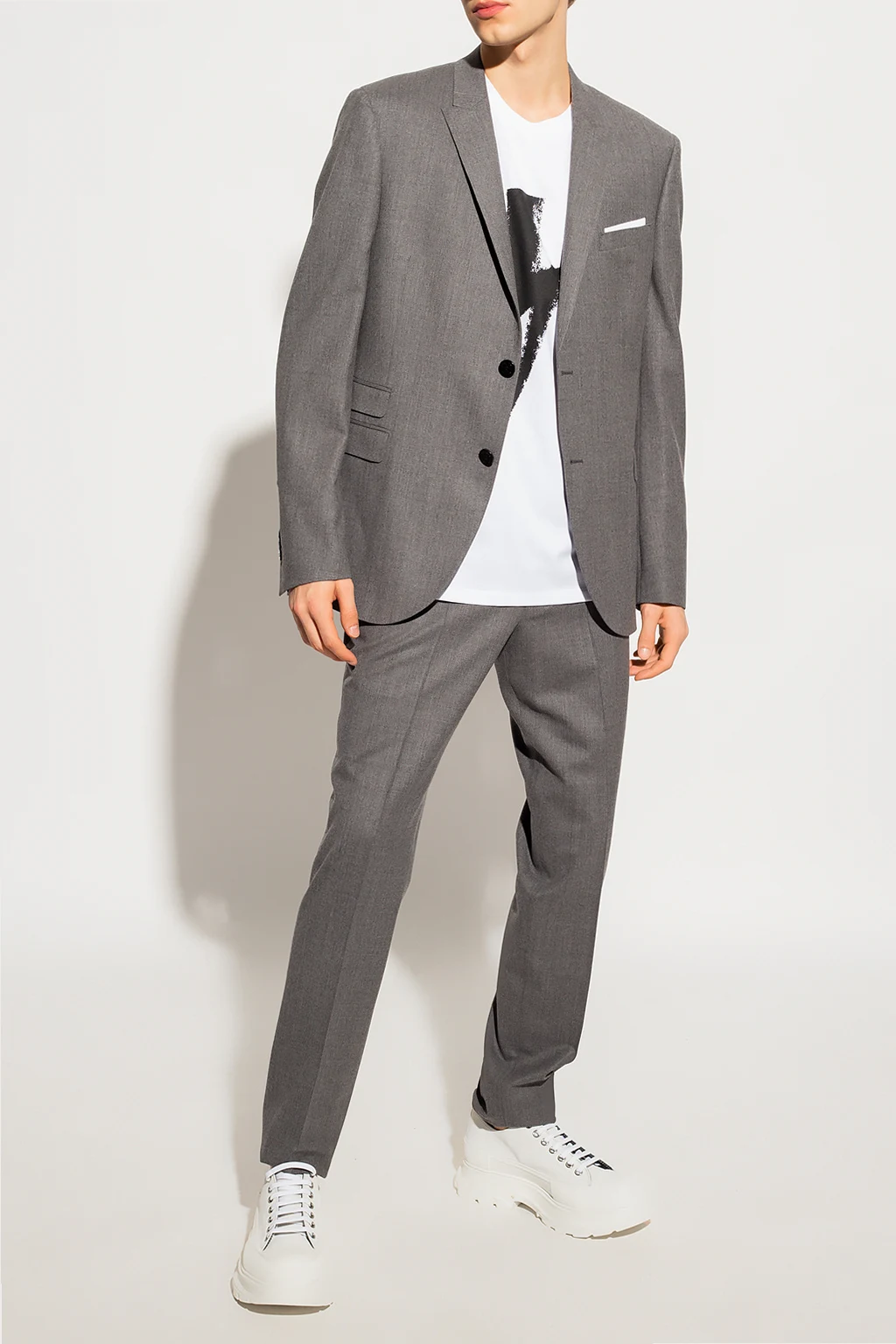 Grey suit from Neil Barrett. Made of wool, it includes a blazer with peak lapels, button fastenings, two flapped pockets, one slip pocket and a double back vent as well as pleat-front trousers with a zip fly with buttons, two side seam pockets, two back button pockets and slightly tapered legs with raw hems.