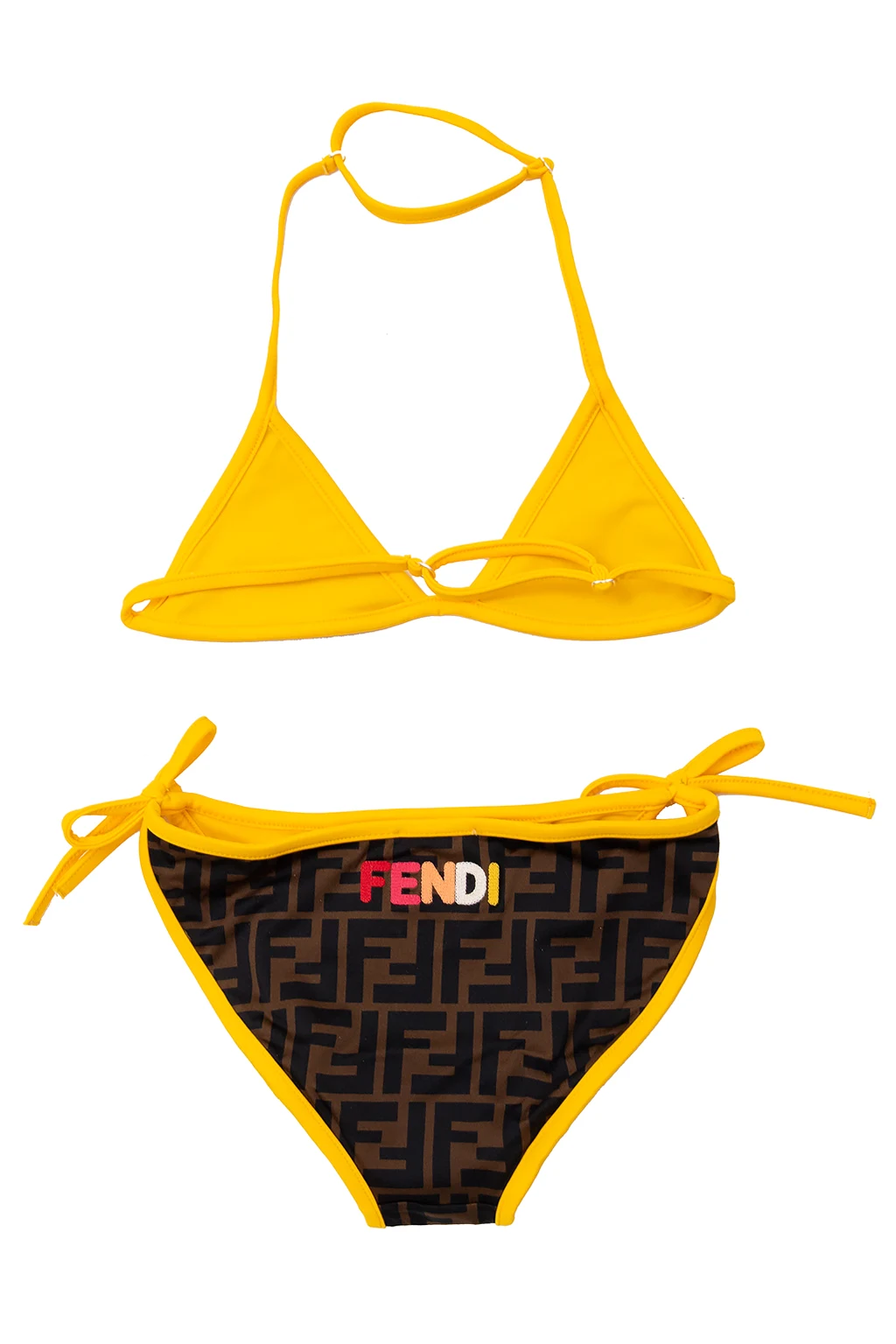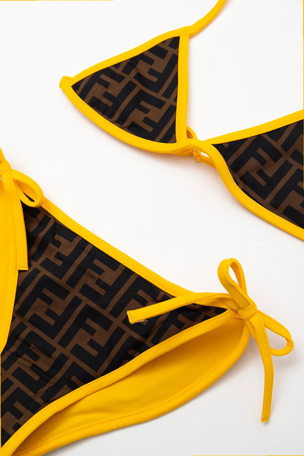 Brown and orange two-piece swimsuit from Fendi. Decorated with an all-over logo pattern, the set features tie fastenings and a multicolored logo embroidery at the back.