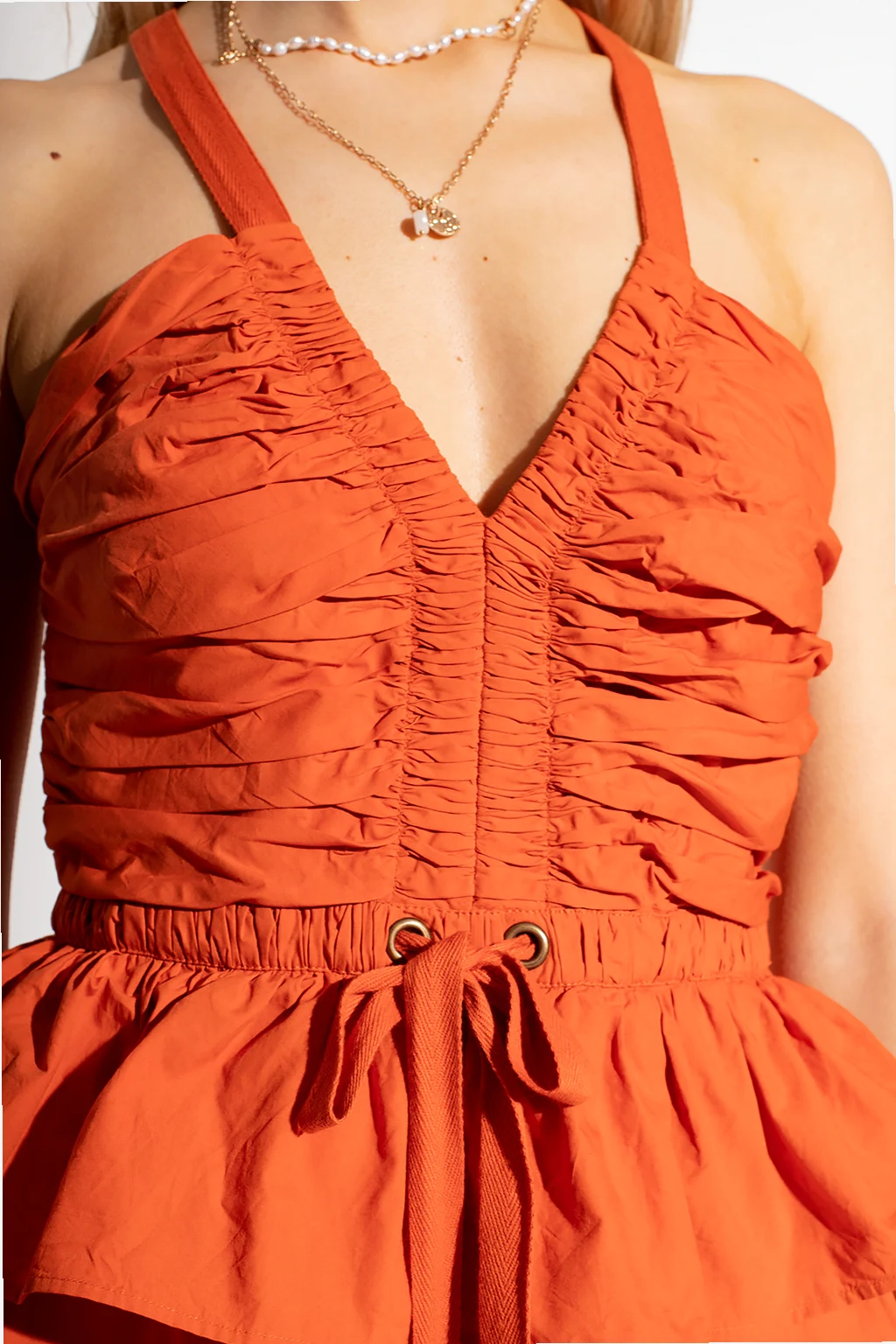 Orange ‘Marren’ sleeveless jumpsuit from Ulla Johnson. Crafted from cotton, this garment features a side zip and hook, drawstring waist, decorative gathers, ruffle and two front pockets.