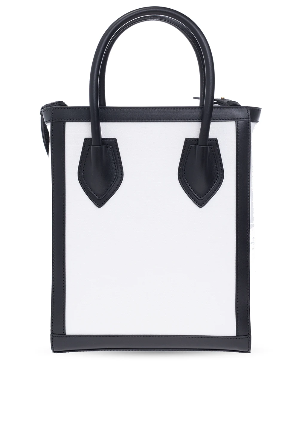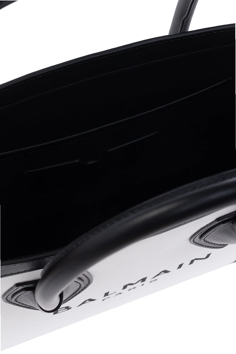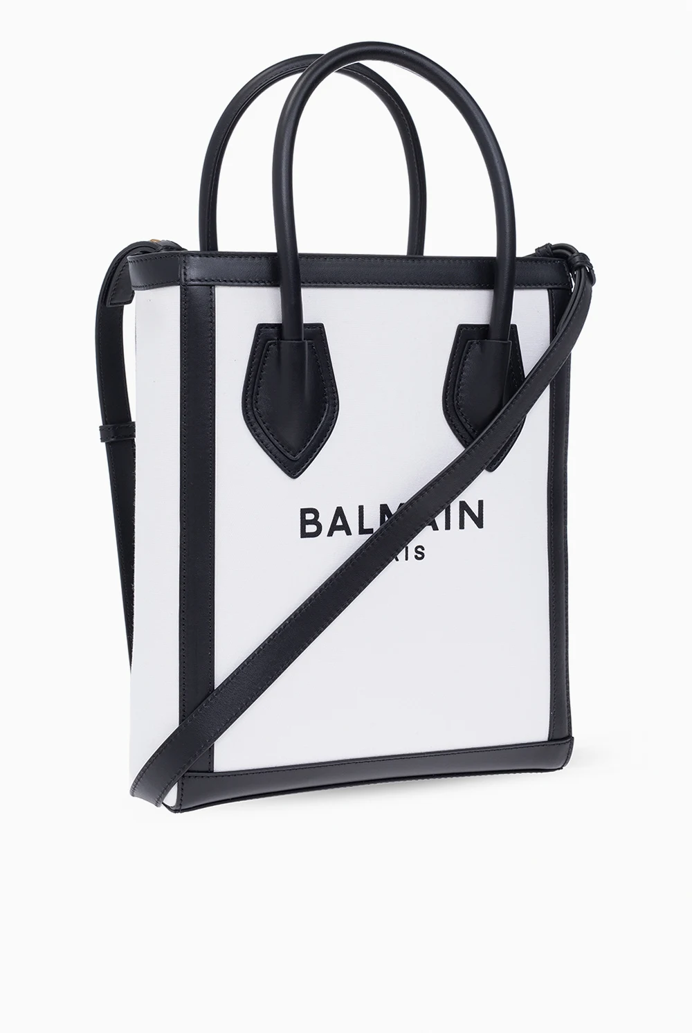 White and black 'B-Army 26' shopper bag from Balmain. Made of cotton with calf leather trims, this model features a logo print, two half-round handles, adjustable strap, gold-tone metal hardware and one internal compartment with one slip pocket and one card slot.