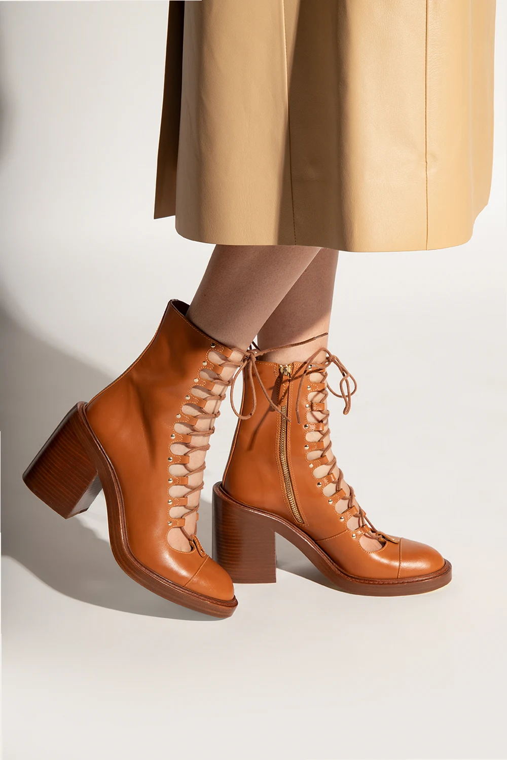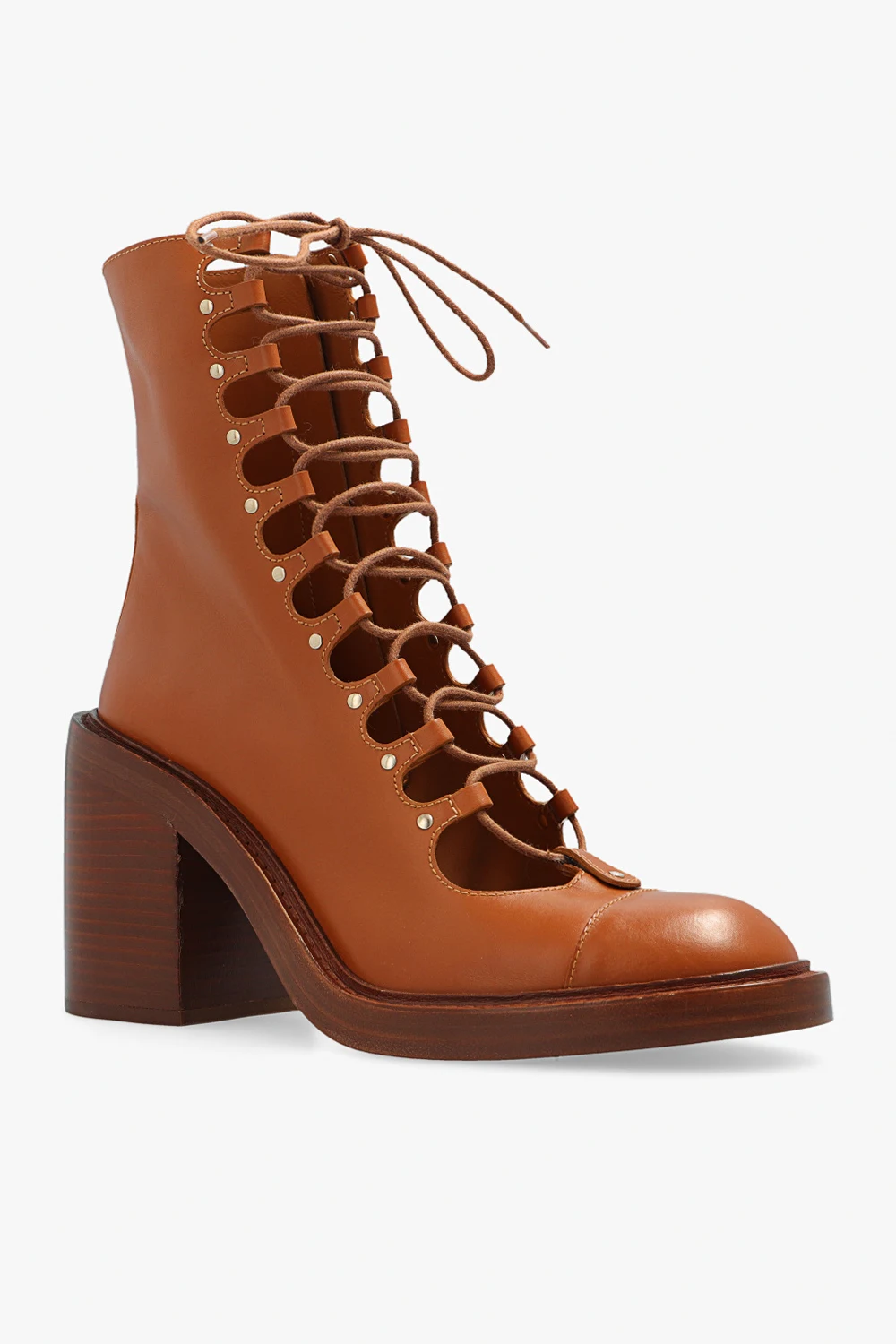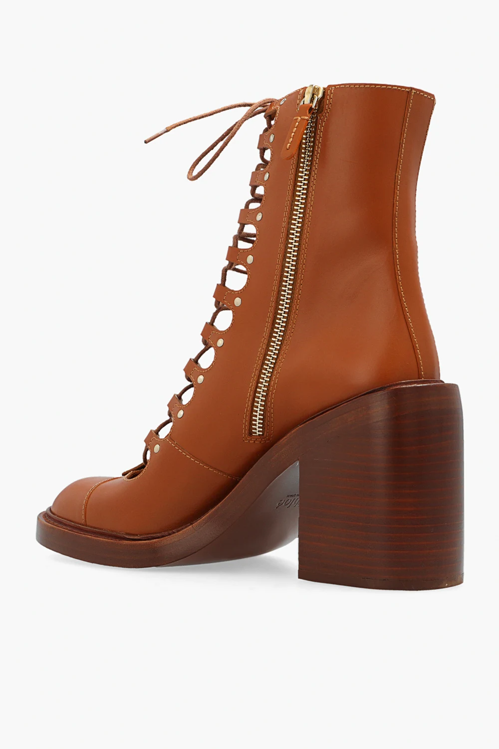 Brown ‘May’ heeled boots from Chloé. Made of leather, this pair is complete with a side zip, decorative lacing, round toe and brown leather sole.