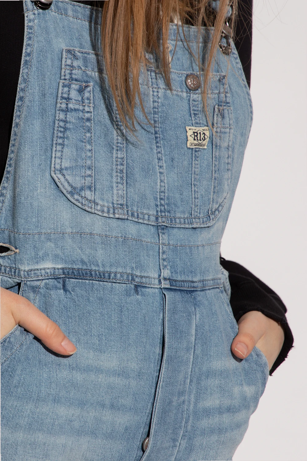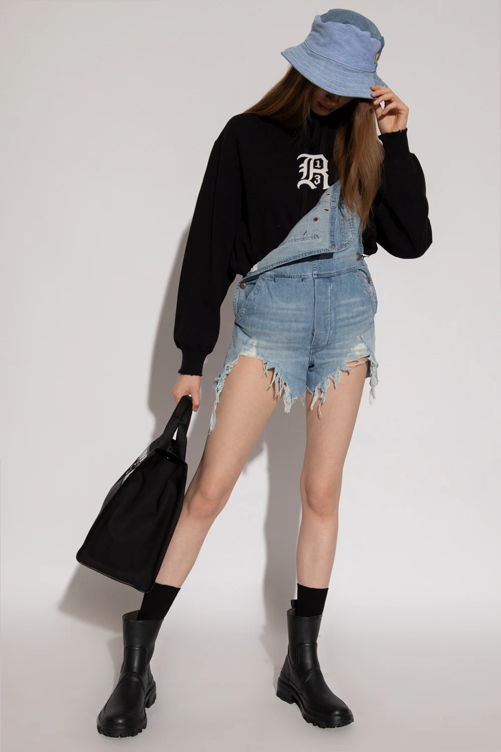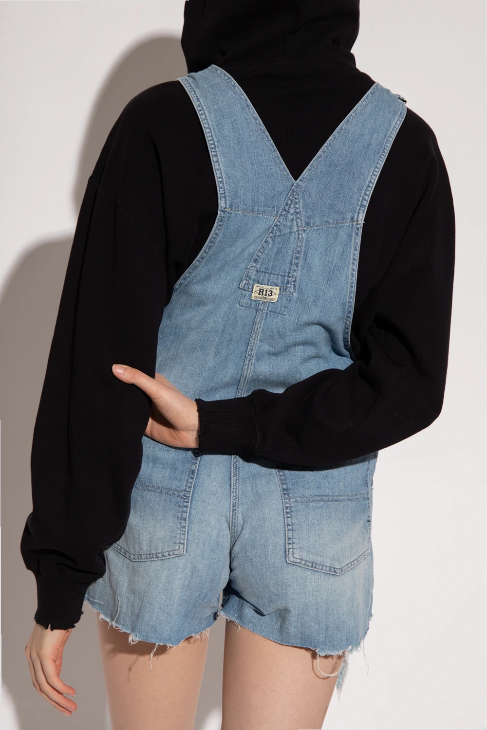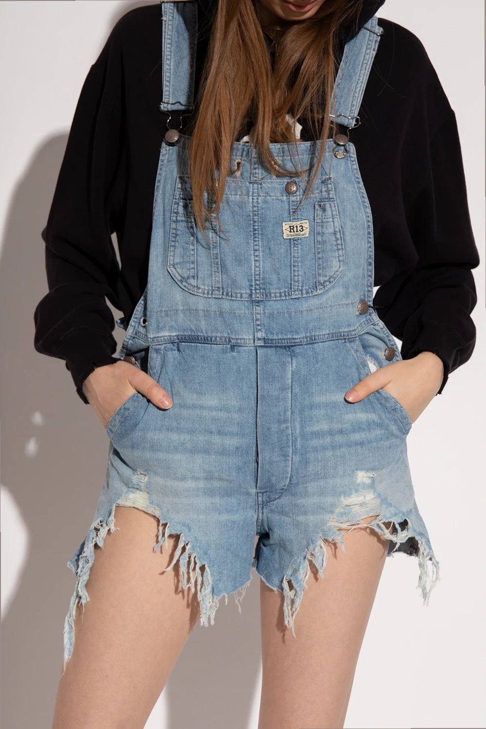 Light blue dungarees from R13. Enriched by a vintage effect, this garment features decorative metal buttons, four slip pockets, two buttoned pockets, two adjustable shoulder straps with hooks and raw cut edges.