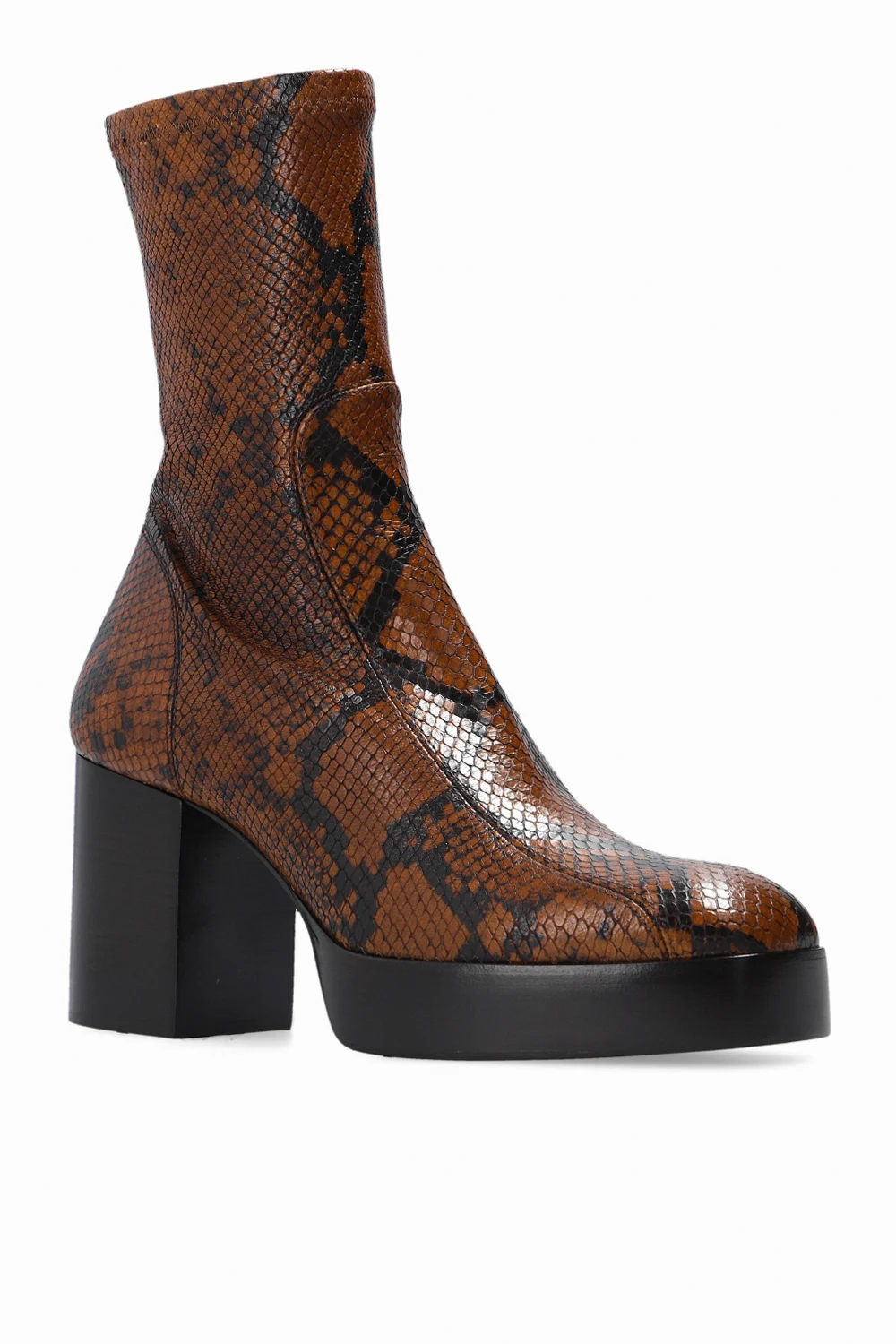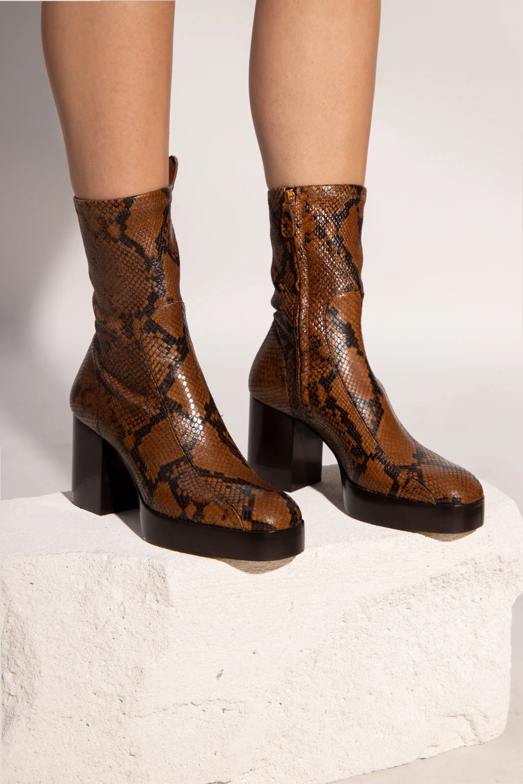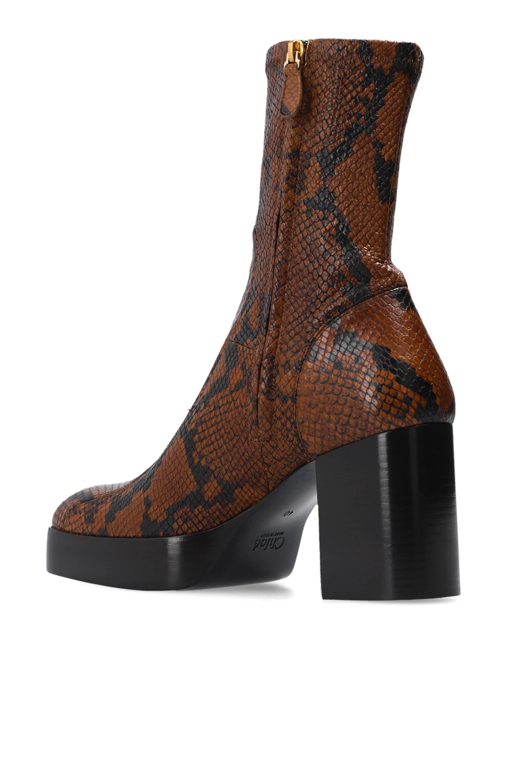 Brown ‘Izzie’ pumps from Chloé. Crafted from leather and embellished with an animal motif, they sit on a dark brown leather sole and feature a zip fastening and an almond-shaped toe.