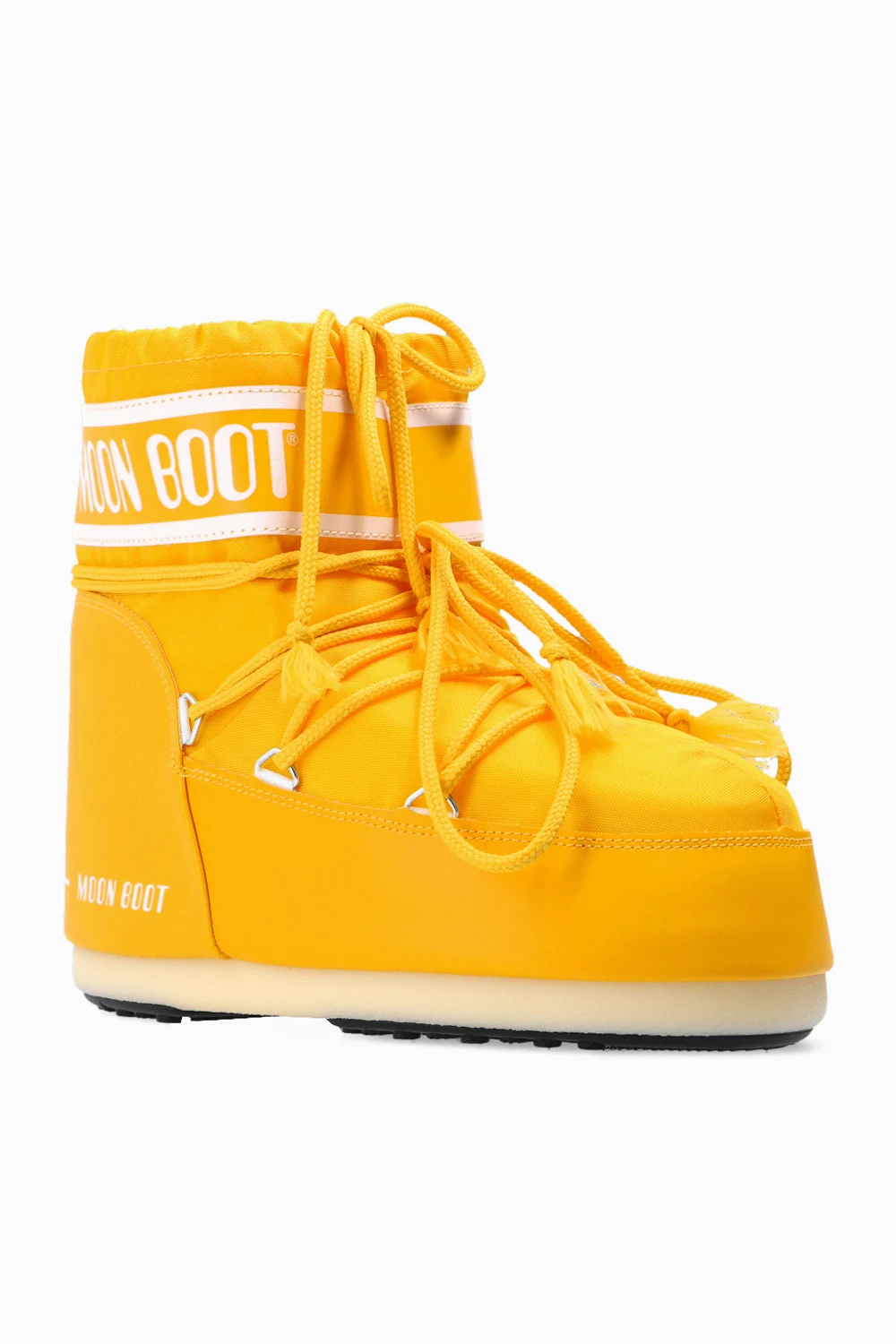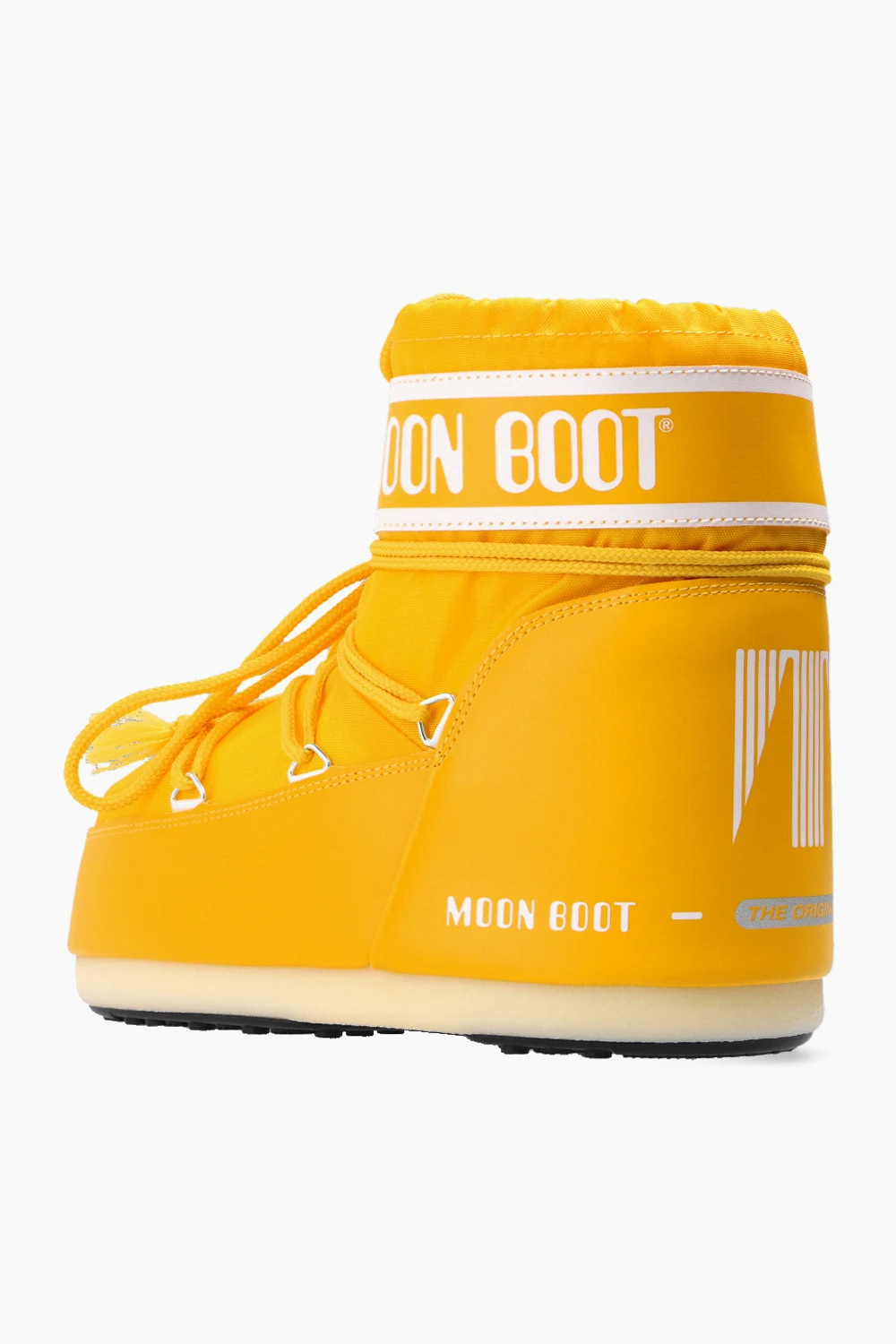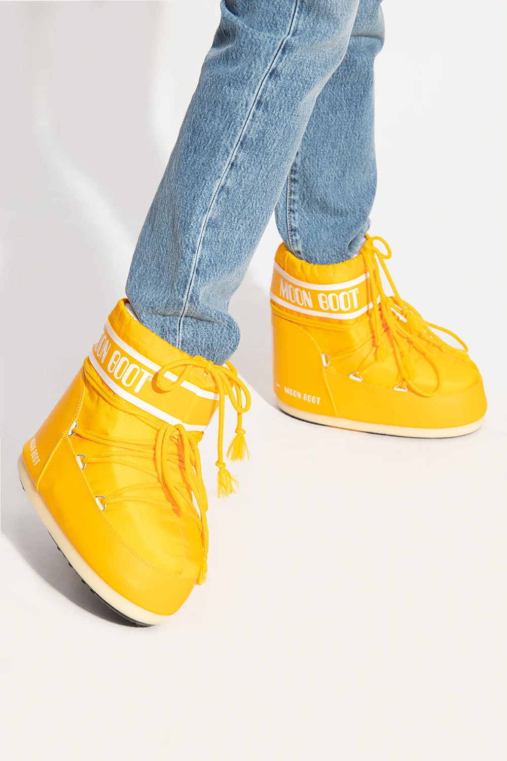 Yellow ‘Classic Low’ snow boots from Moon Boot. Printed with the brand's logo in white, this model sits on a black and cream rubber sole and features distinctive laces and silver-tone metal hardware. Inspired by the peculiar shape and technology of the astronauts' boots, the iconic style was designed in 1969 after the first Moon landing.