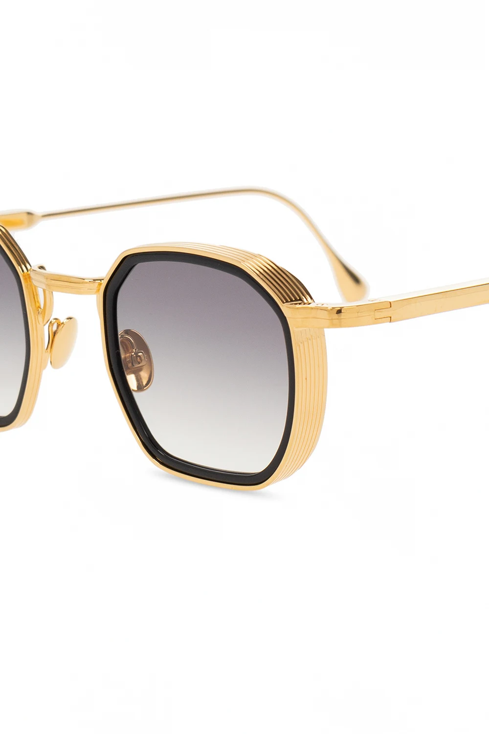 Gold-tone ‘Leo’ sunglasses from John Dalia. Finished with black matte acetate and 22-carat gold, this square frame style features a decorative bridge in brown, certified, gradient lenses with 100% UVA/UVB protection. Case included.