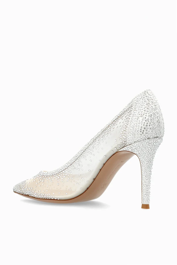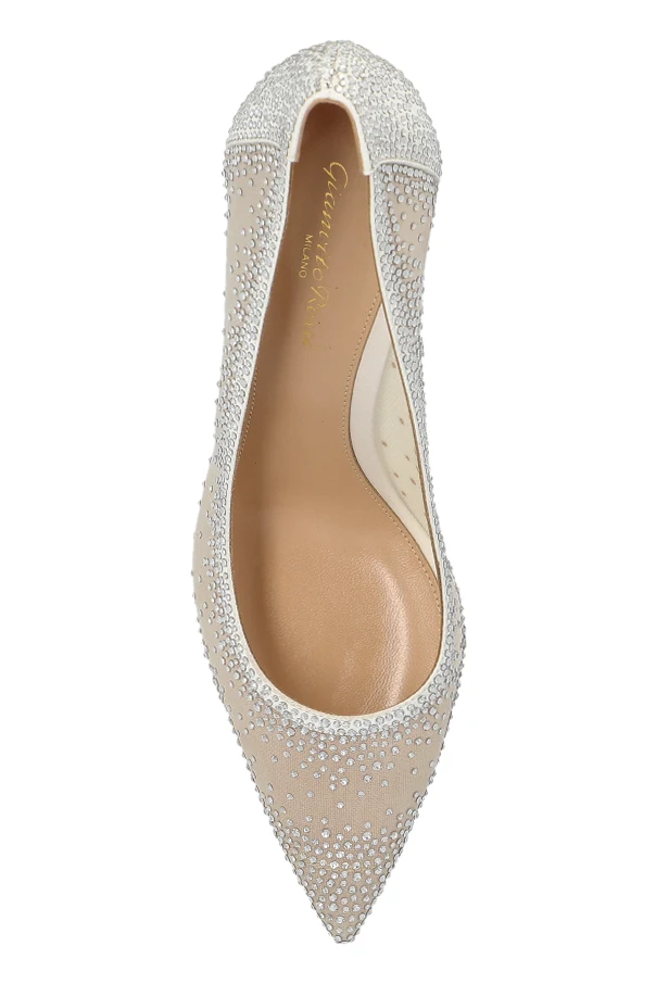 Das Obermaterial aus transparenter Mesh, kunstvoll mit zahlreichen Kristallen verziert, zieht mit seinem einzigartigen, funkelnden Effekt alle Blicke auf sich. Verstärkte Partien an Ferse und Spitze unterstreichen die luxuriöse Ästhetik mit intensiv schimmernden Details zusätzlich. Im Inneren des Schuhs entdecken Sie eine edle Lammleder-Innensohle, geschmückt mit einer goldenen Signatur des Designers.