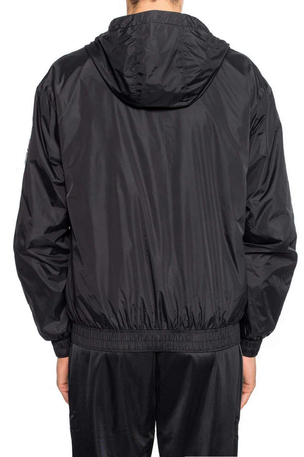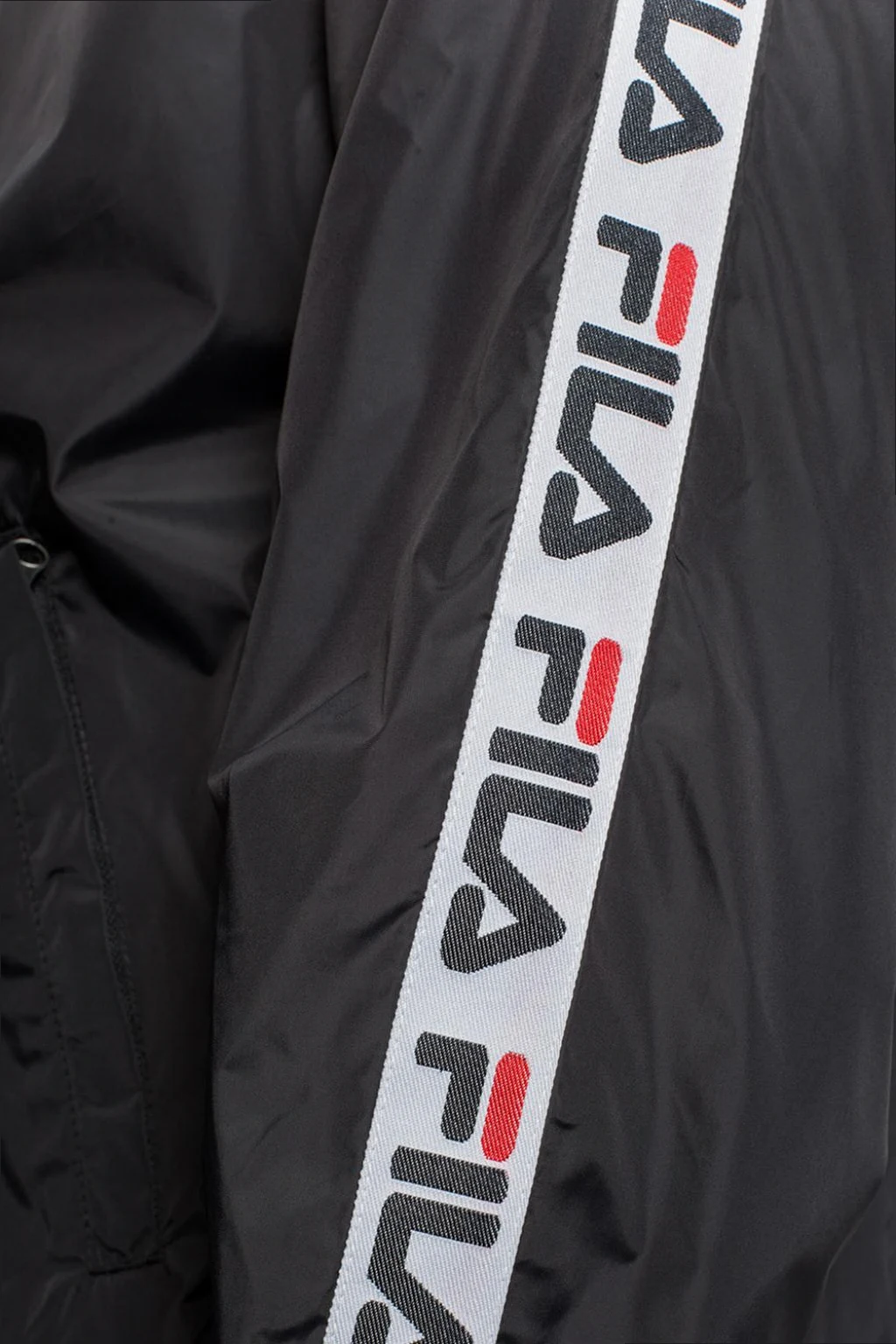 Black, polyamide jacket with a hood from Fila. Zippered. On the front an embroidered logo in red-white and two zippered pockets. On the sleeves stripes including a logo in white, red and black. Bottom and sleeves finished with welts.