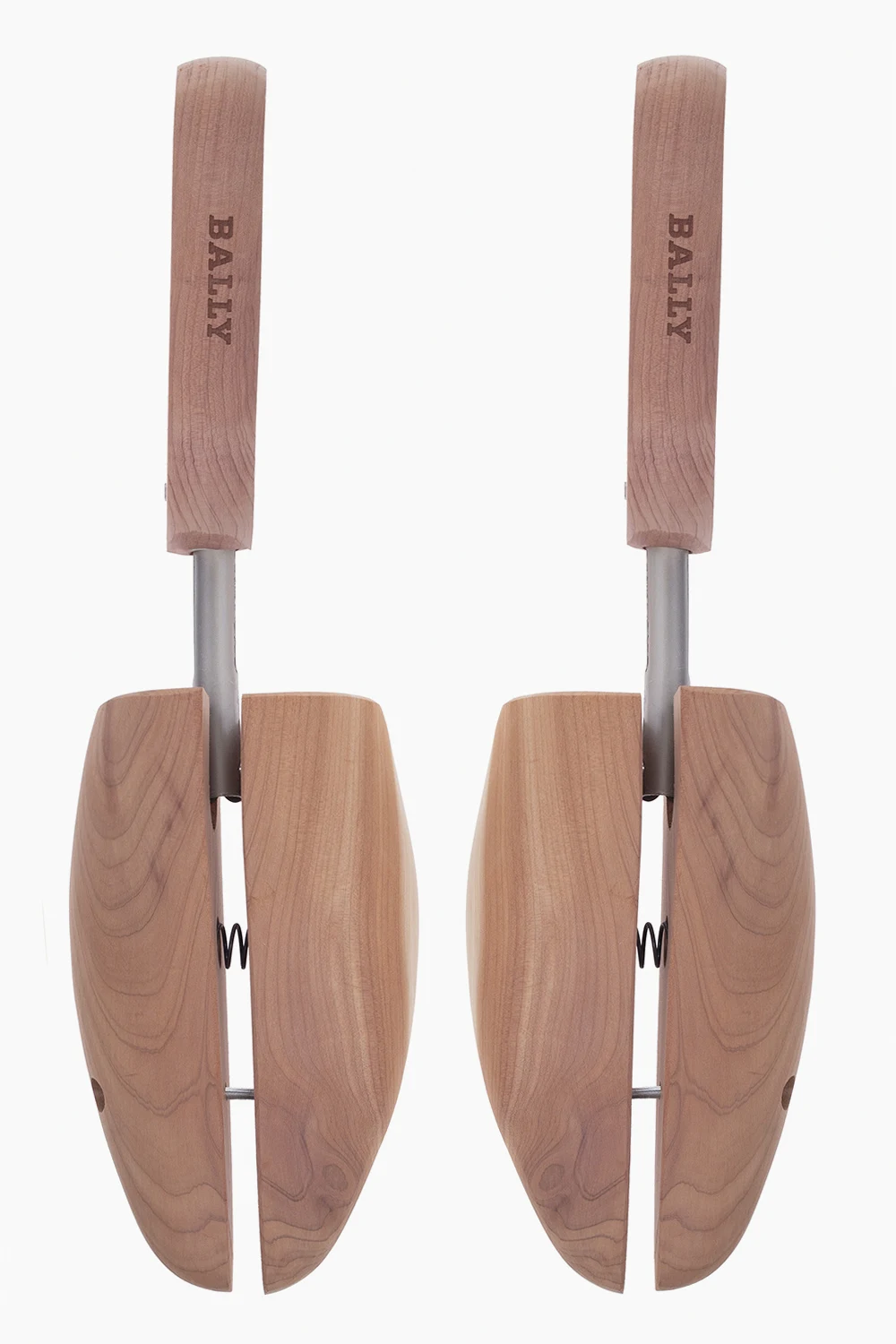 Light brown shoe horns from Bally. Made of wood, this design is decorated with an engraved logo.