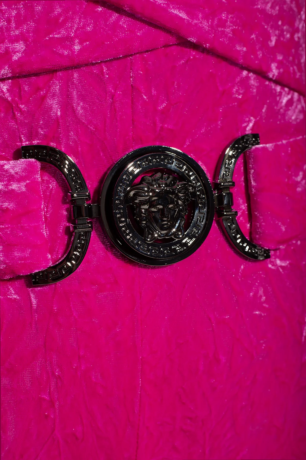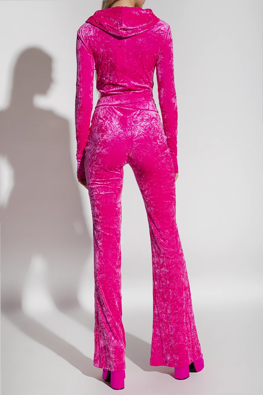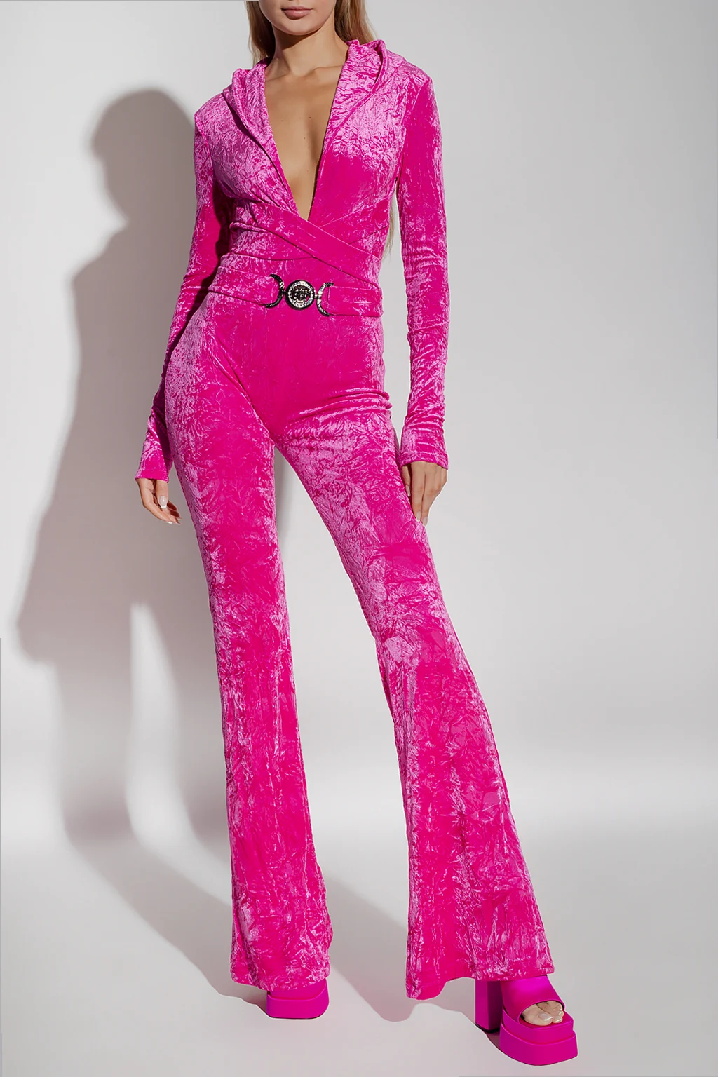 Pink jumpsuit with a hood from Versace. Crafted in stretchy velvet material, this style features a plunging V-neckline, long sleeves, flared legs and crisscross Medusa Biggie belt with a Greek pattern at the waist.