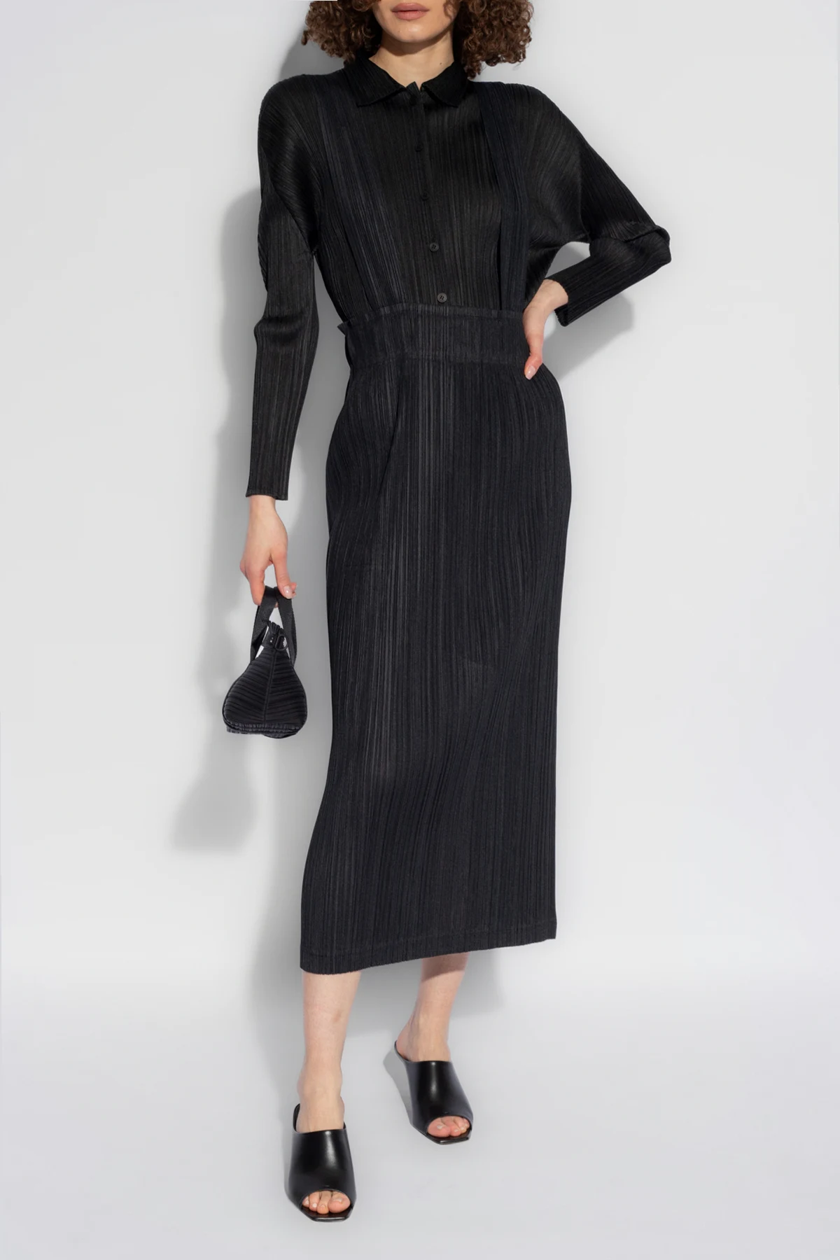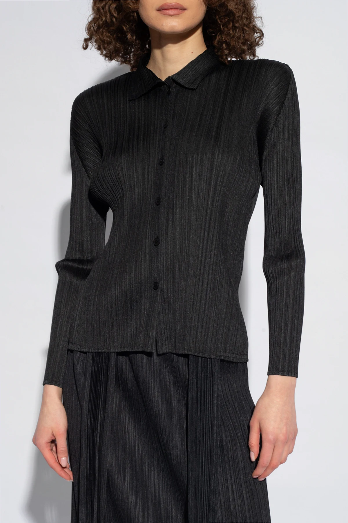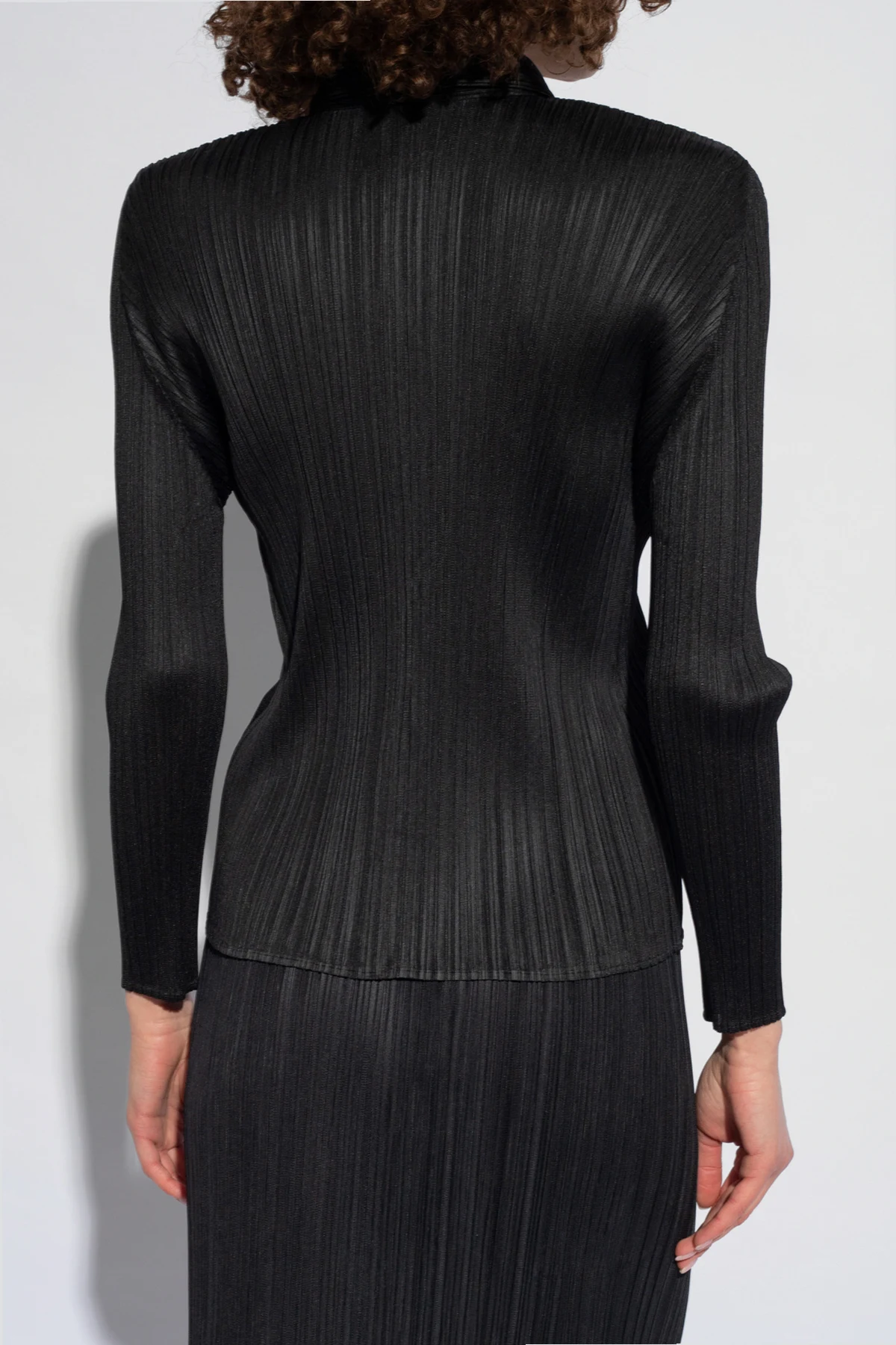 Wir präsentieren Ihnen eine raffinierte, plissierte Bluse des geschätzten Designers Issey Miyake , aus der Kollektion Pleats Please . Dieses vielseitige, schwarze Meisterstück vereint klassische Eleganz mit modernen Trends und ist die perfekte Wahl für Personen, die einen ausgefeilten Stil schätzen. Gefertigt aus hochwertigem Polyester , besticht sie durch einen zarten Schimmer und ein vertikales Plissee-Muster, das ihr einen unverwechselbaren Charakter verleiht.