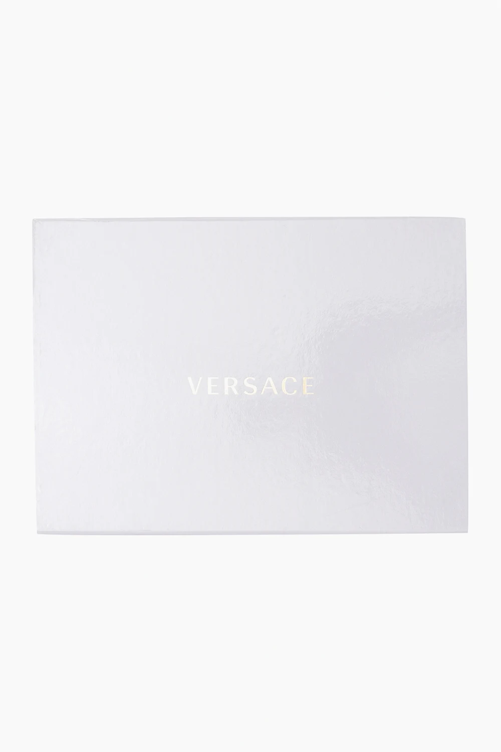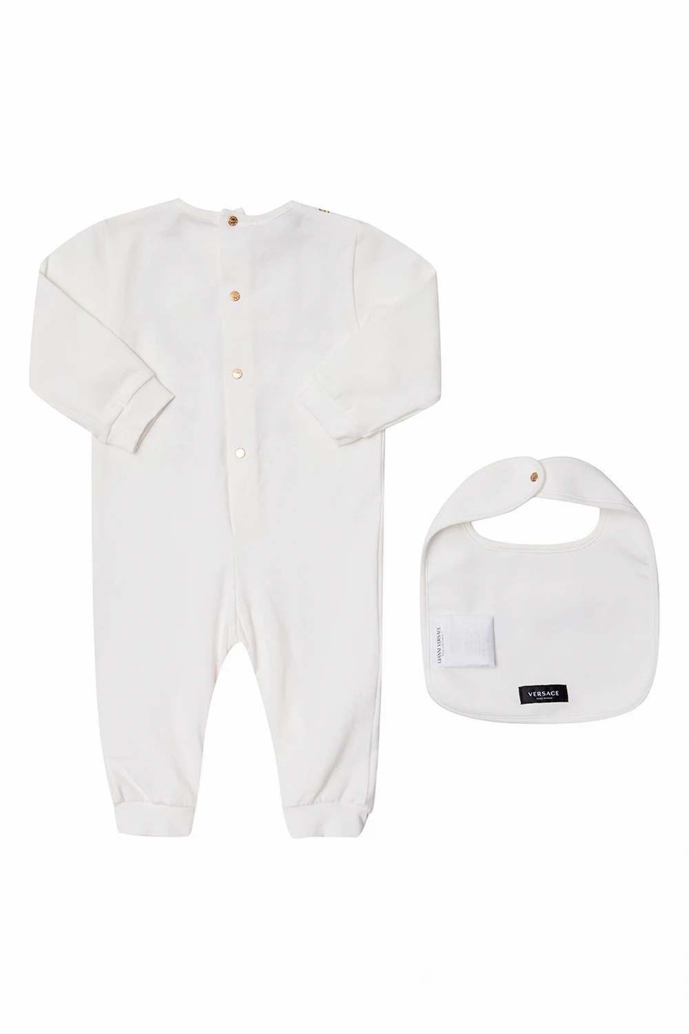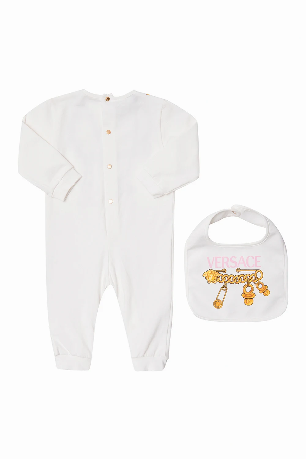 White bodysuit and bib set from Versace Kid. Made of cotton. Bodysuit has snap closures and a yellow, orange and pink graphic print. Bib features snap closures and a yellow and orange print and pink logo detailing.