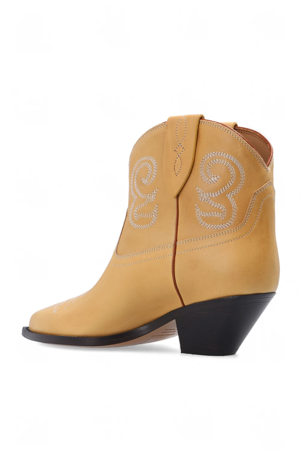 Yellowish beige ‘Dohee’ ankle boots from Isabel Marant. Made of calf leather, this slip-on pair features white decorative stitching details and leather sole in beige and brown.