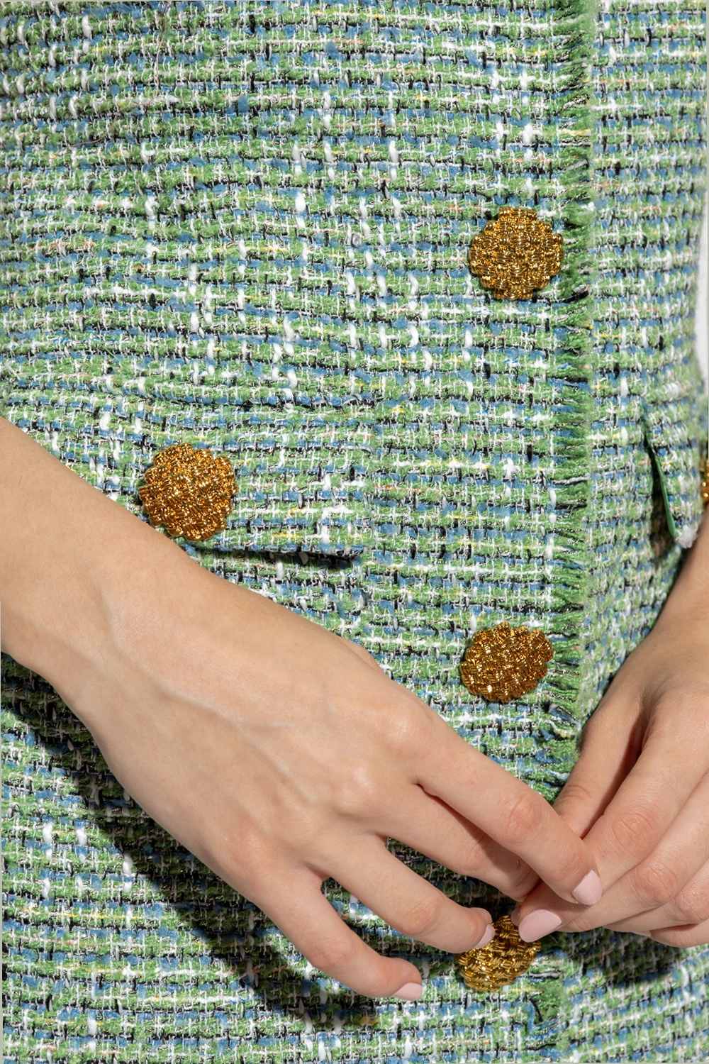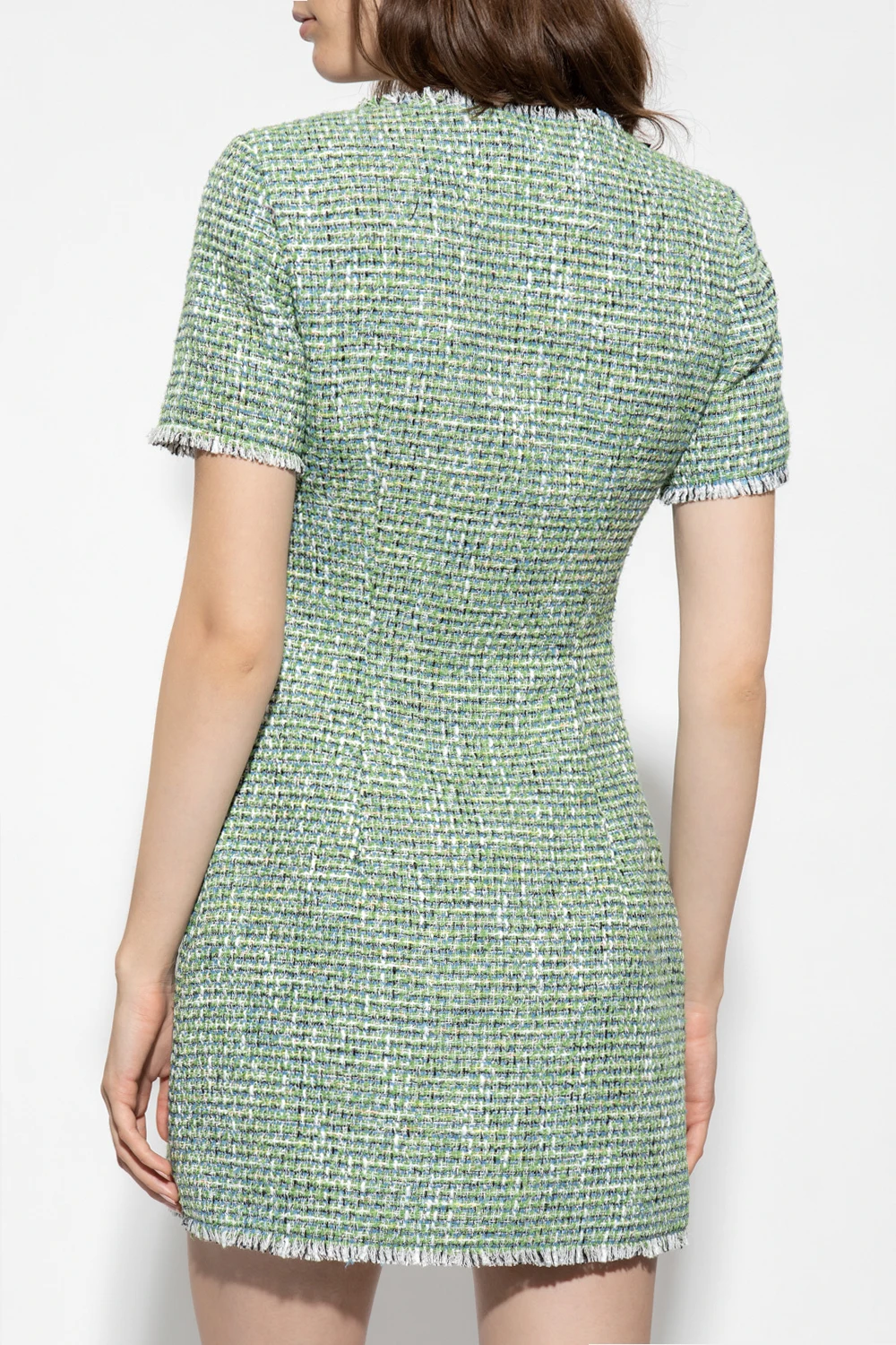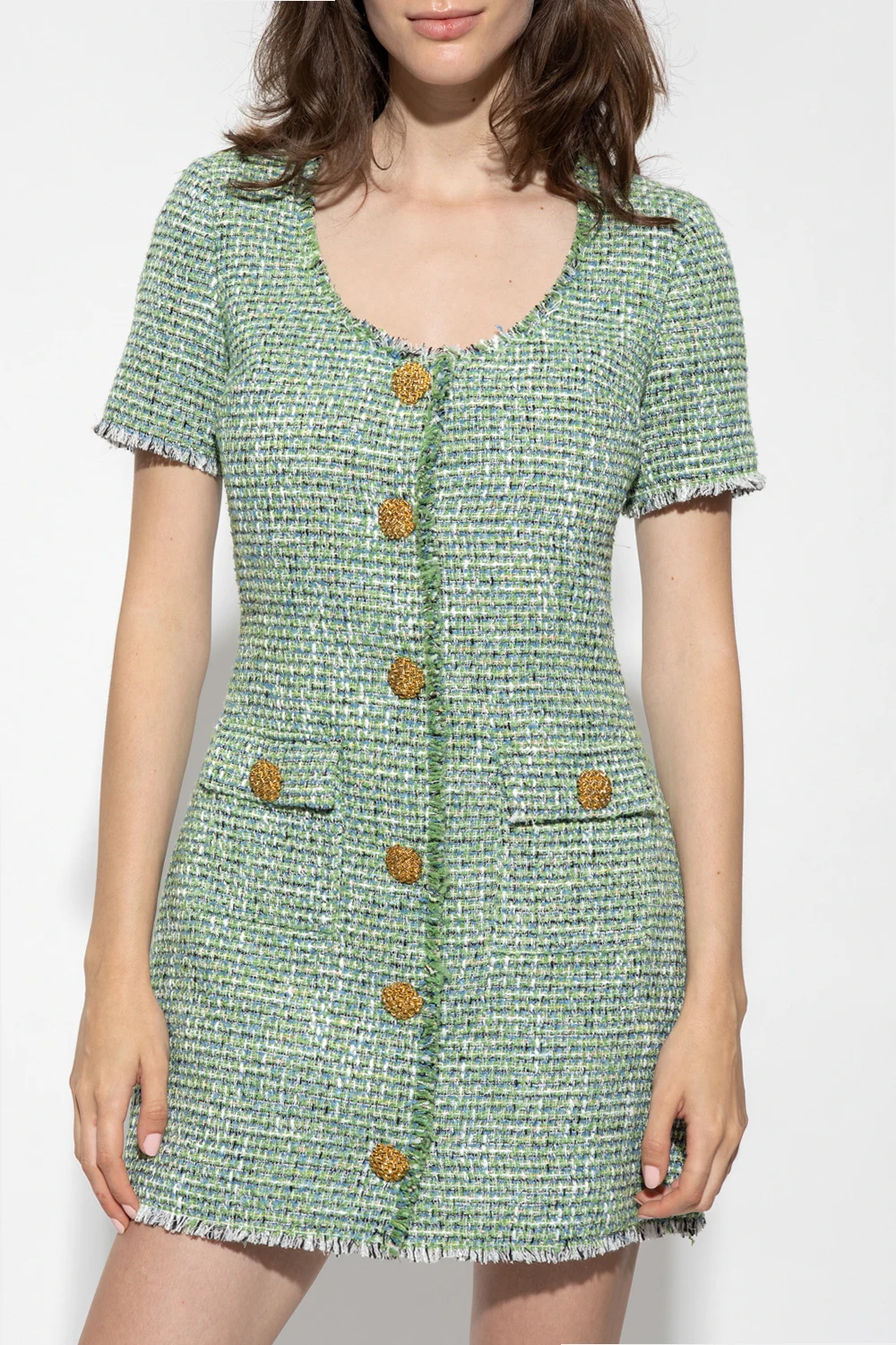 Green dress from Self Portrait. Crafted in checked boucle with metallic thread trims, this style features a round neck, short sleeves, decorative snaps with gold-tone buttons, fringe detailing and two snap-fastened flapped pockets.