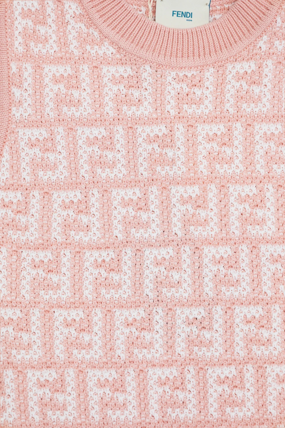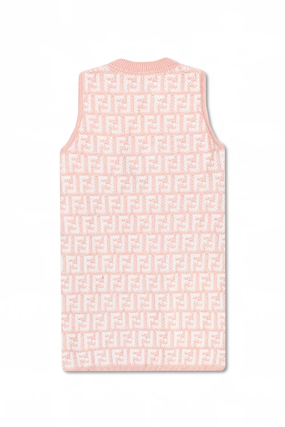 Pink and white sleeveless dress from Fendi Kids. This simple silhouette is enriched by FF embroideries and ribbed trims at the round neck and hem.