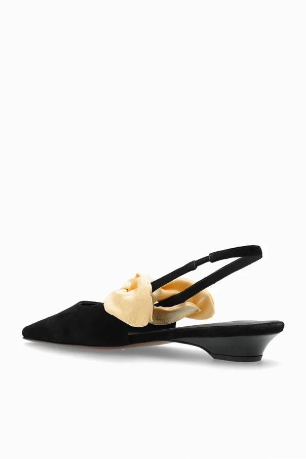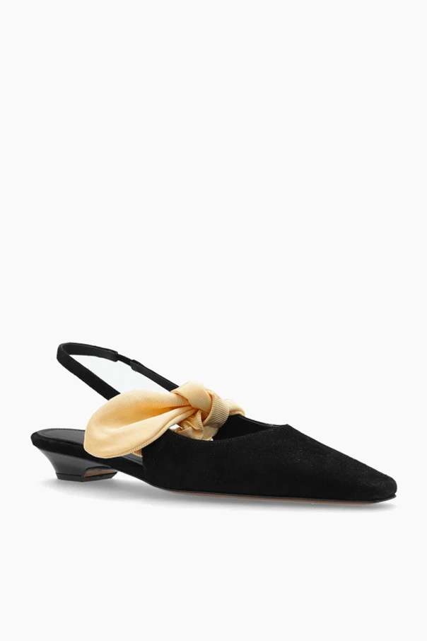 Das Obermaterial aus hochwertigem Veloursleder oder Wildleder in tiefem Schwarz strahlt raffinierte Weichheit und edle Eleganz aus. Die modulare, hellgelbe Satinschleife , die abnehmbar ist, ermöglicht eine individuelle Anpassung des Looks – je nach Anlass. Das Lederfutter, die Ledersohle und die diskrete goldene Logoprägung auf der Innensohle unterstreichen die Exklusivität dieses Designs.
